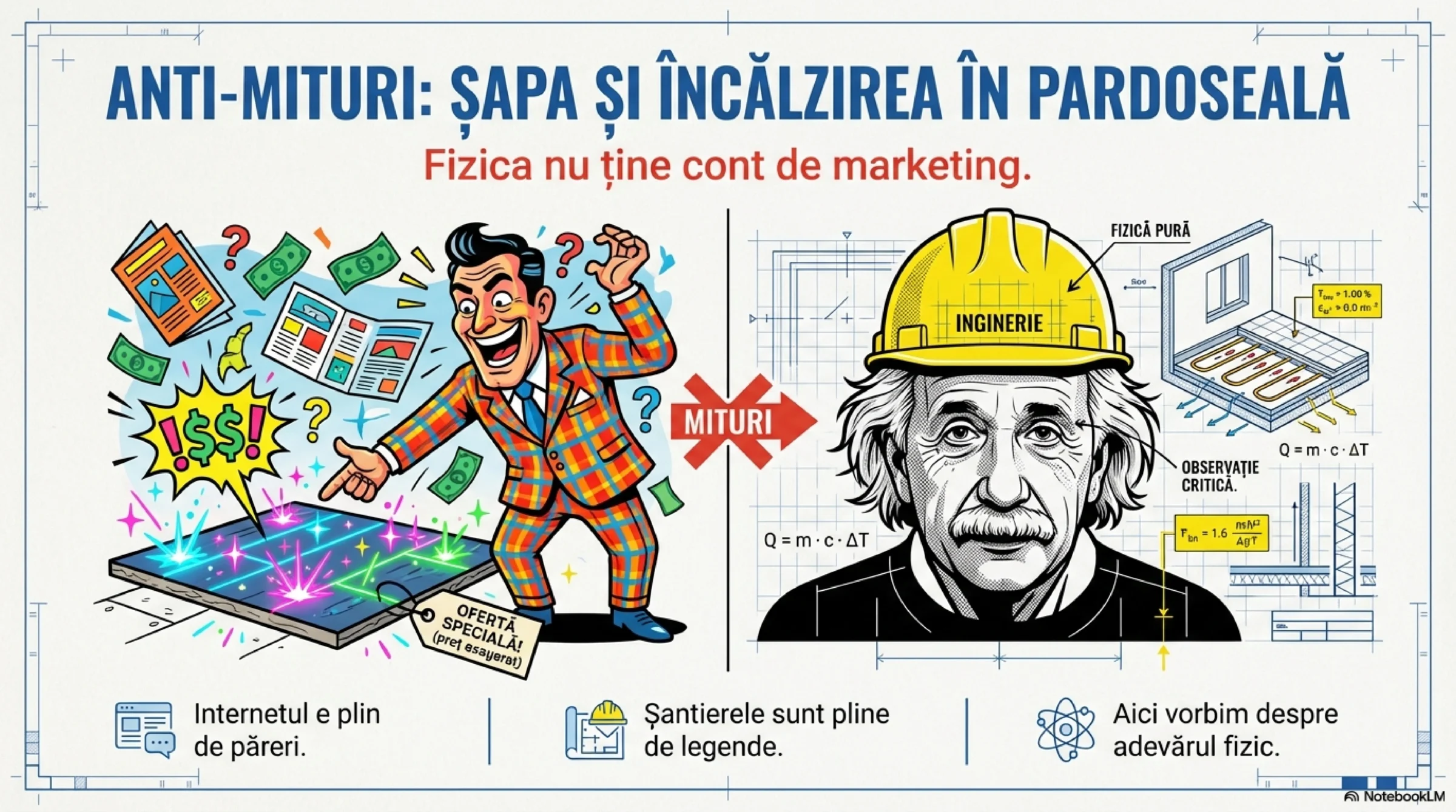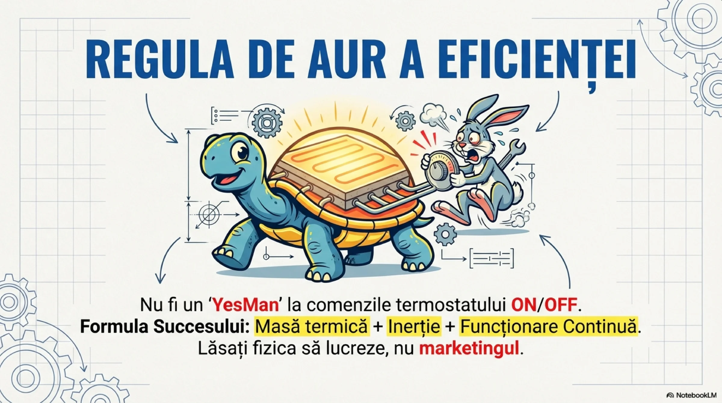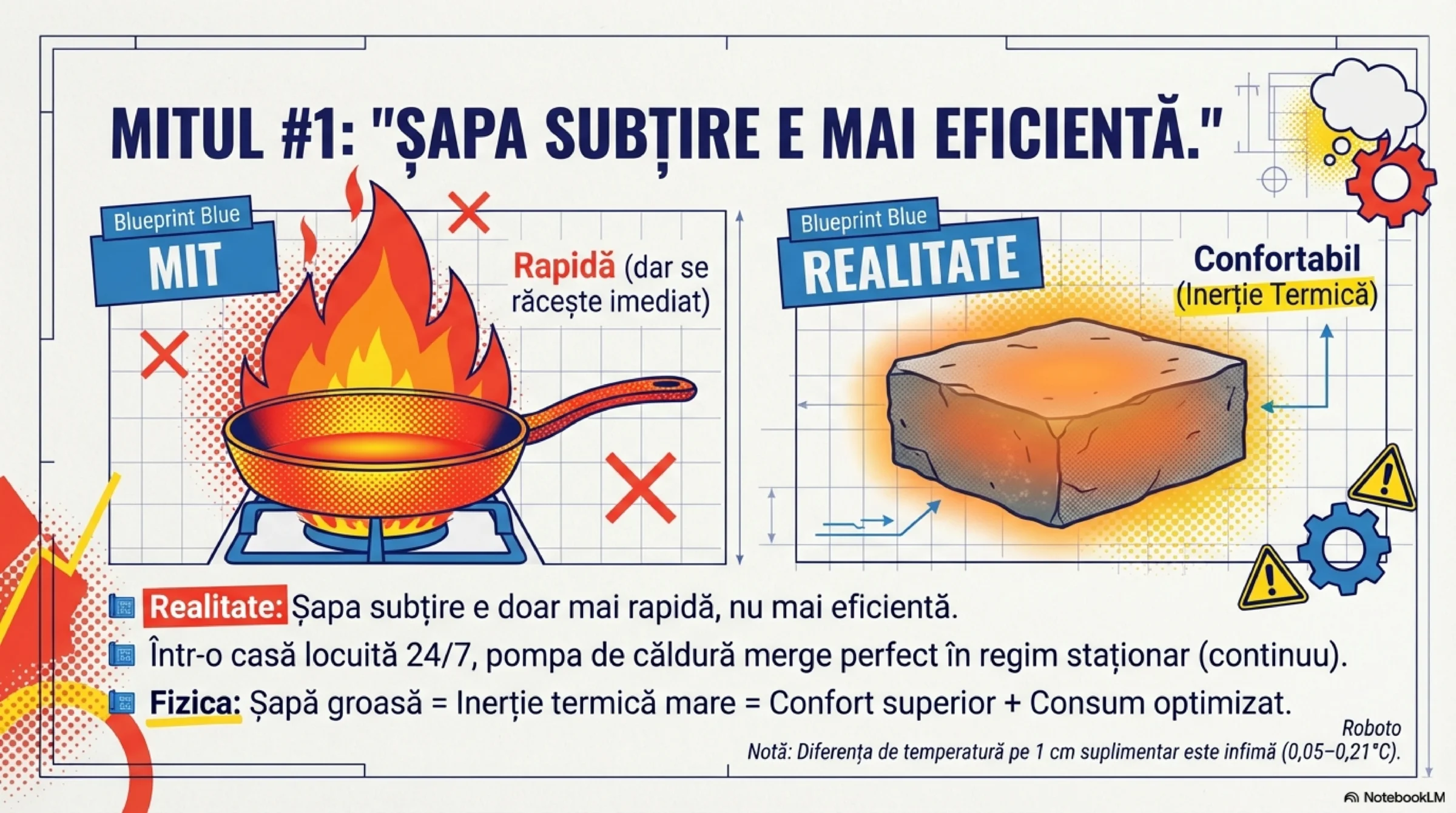 Eficiența absolută nu stă în șape tip «zeamă», turnate la grosime de «țiplă», care să acționeze ca un docil «YesMan» la comenzile termostatelor ON/OFF. Eficiența absolută este fizica aplicată și folosită corect: masă termică, inerție și funcționare continuă.