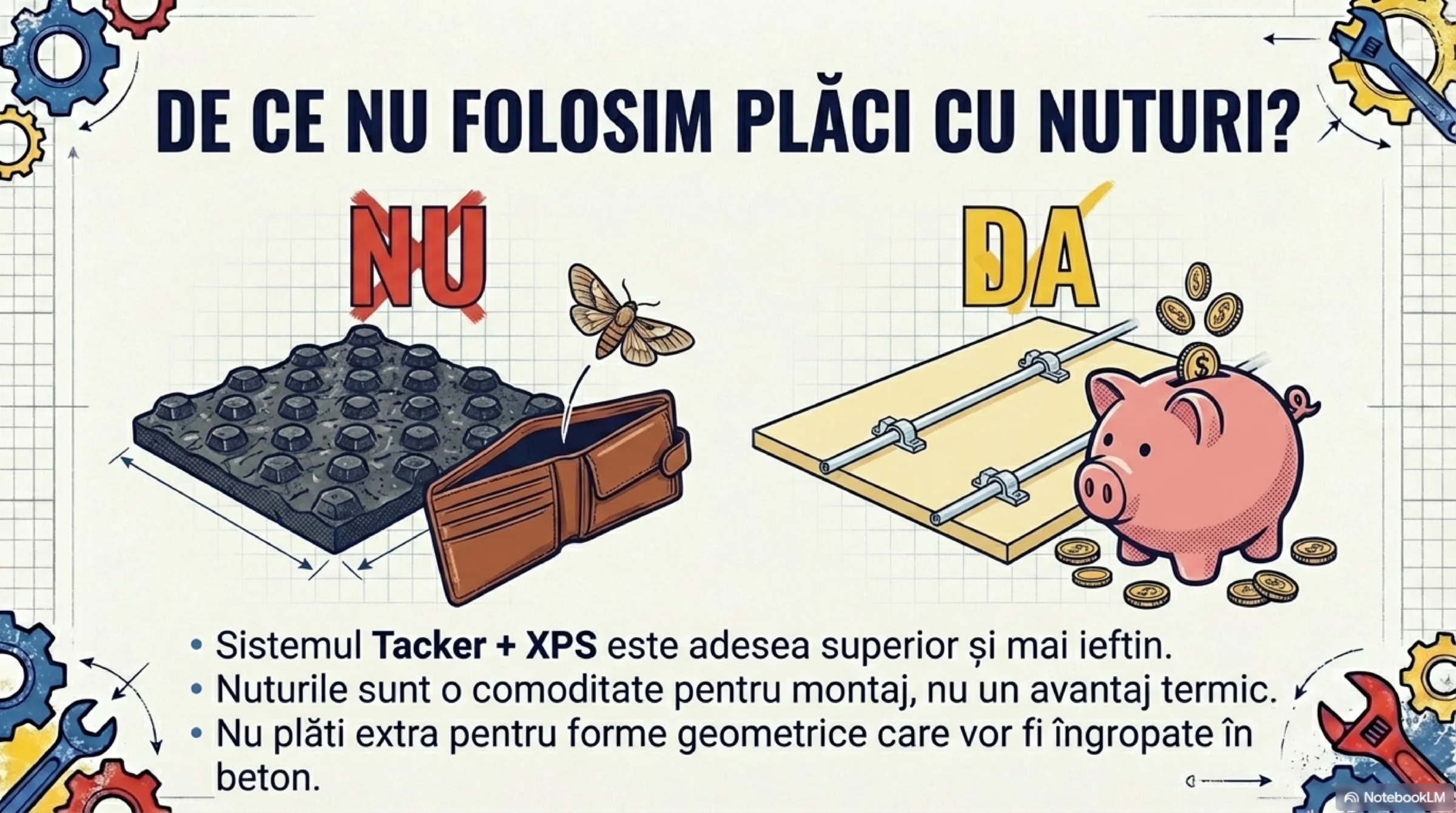 Placă cu nuturi vs tacker vs XPS