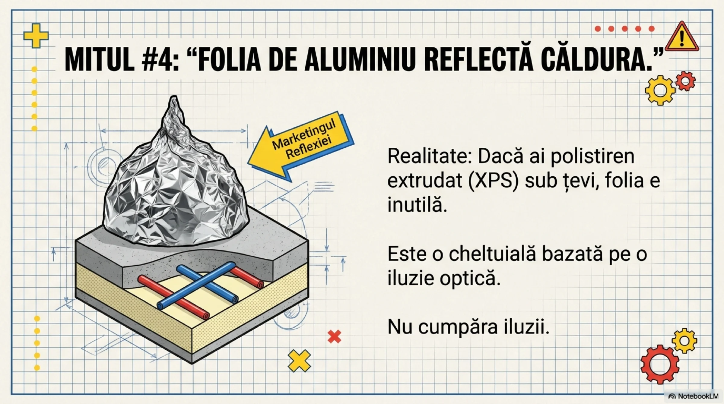 Folia de aluminiu sub șapă NU ajută nicio eficiență.