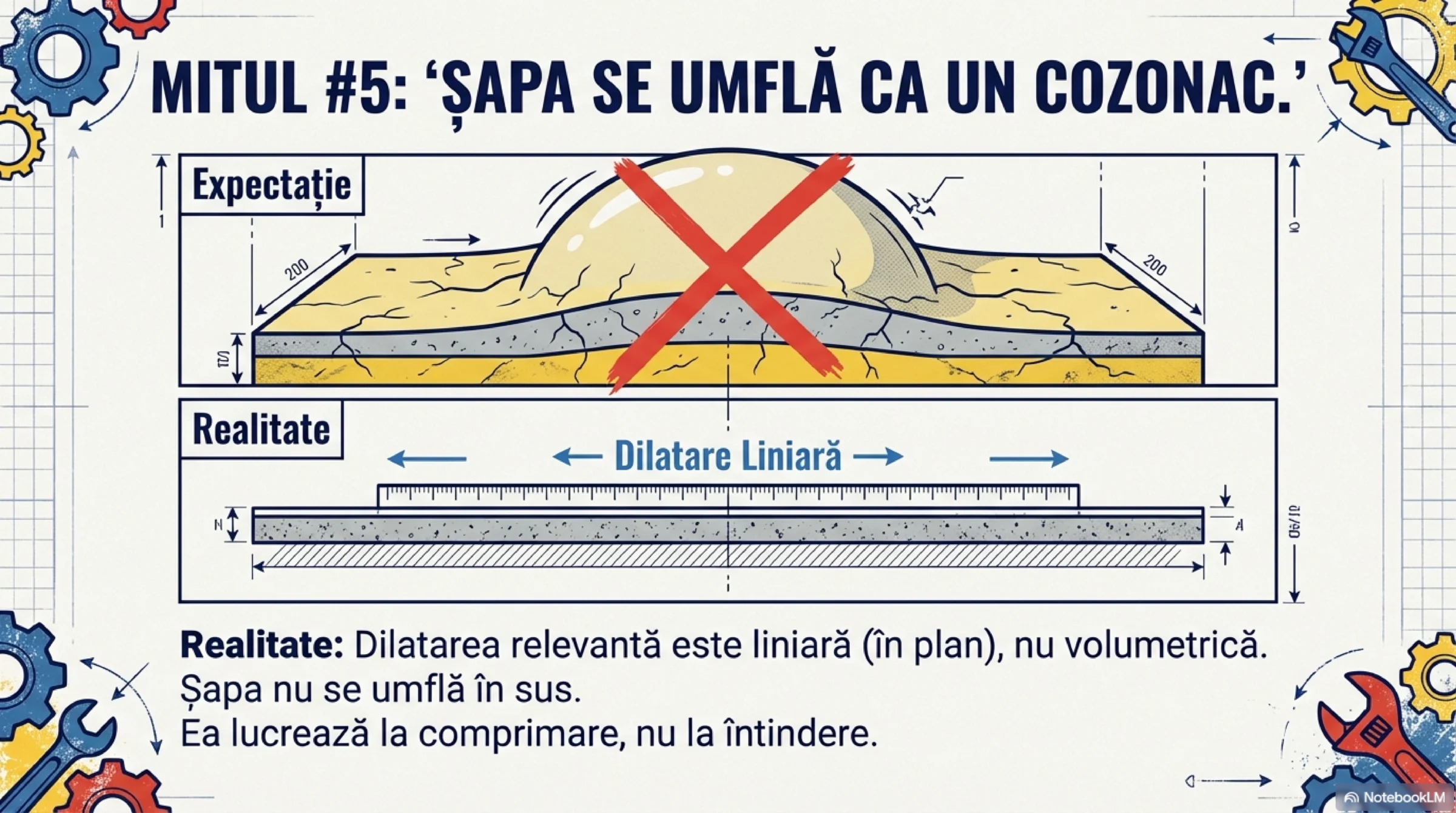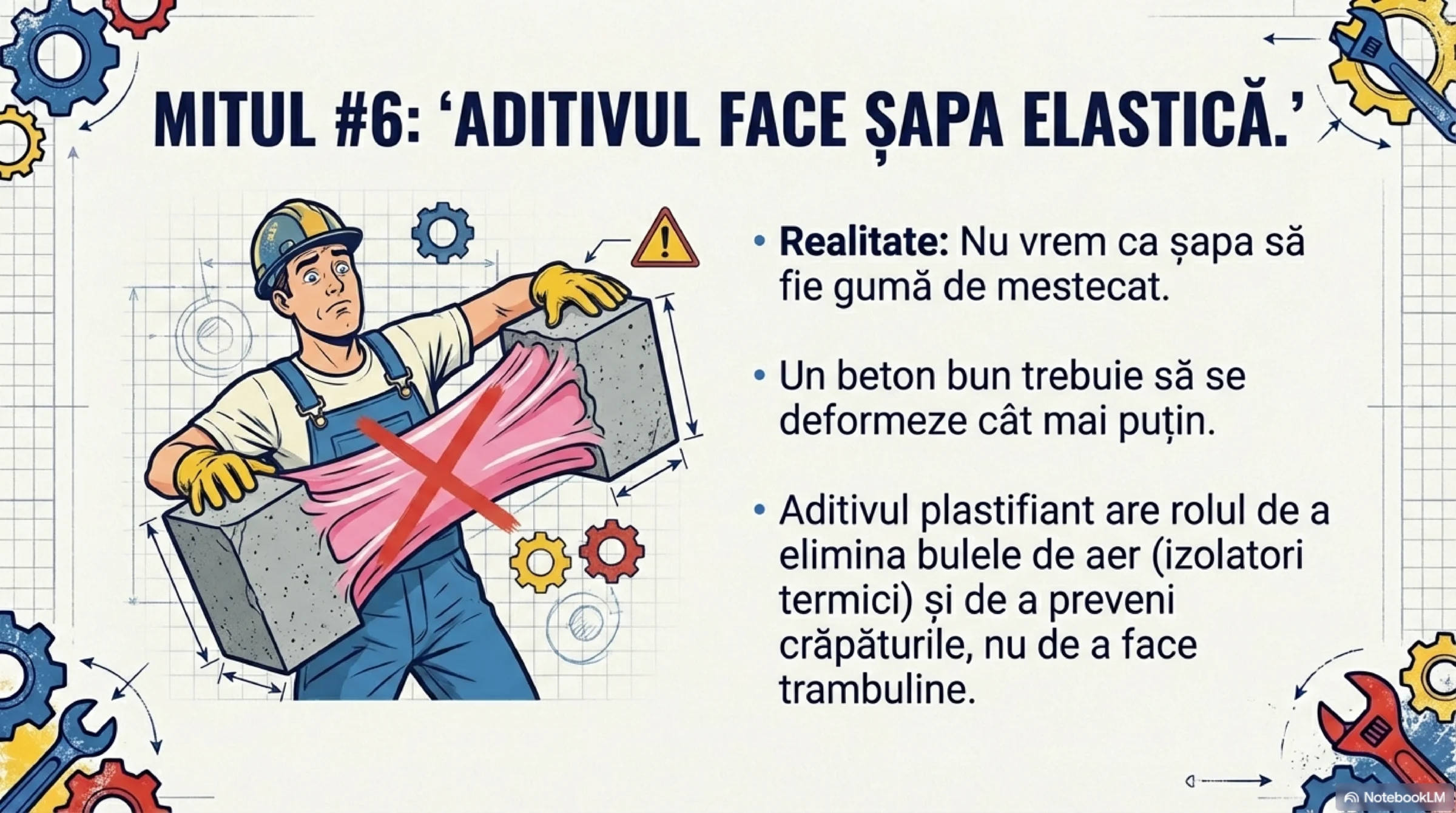 Nu vrem ca șapa să se întindă ca o gumă. Dimpotrivă, un beton bun trebuie să se deformeze cât mai puțin. Rolul aditivului este să asigure o uscare corectă, porozitate uniformă, eliminând bulele de aer (care sunt izolatori termici) și prevenind crăpăturile.
