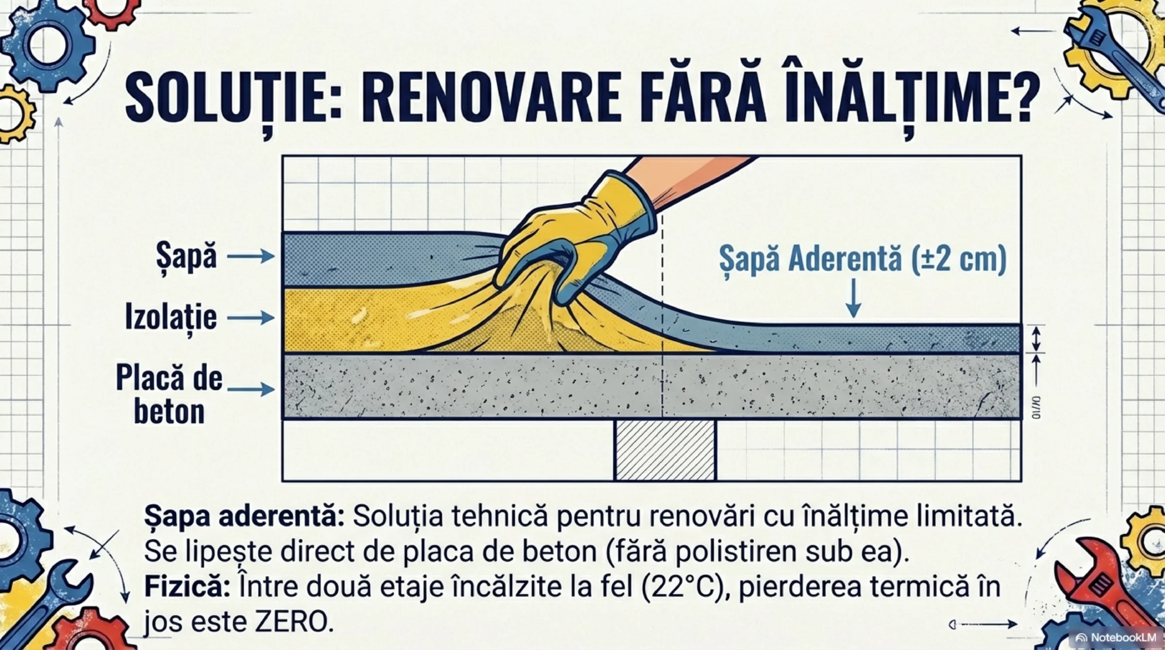 Șapa în aderență este soluția tehnică pentru renovări — disponibil limitat de înălțime.