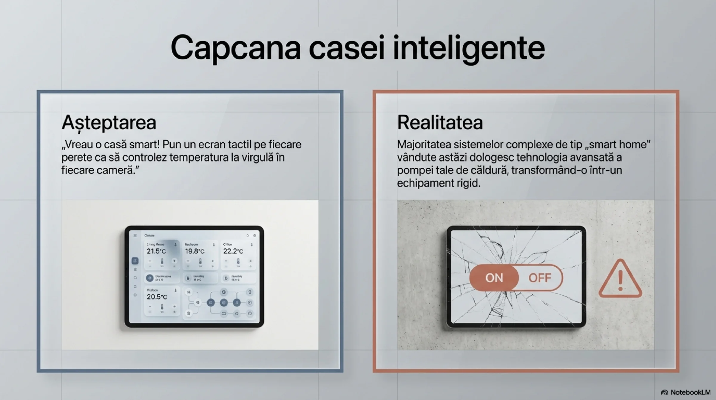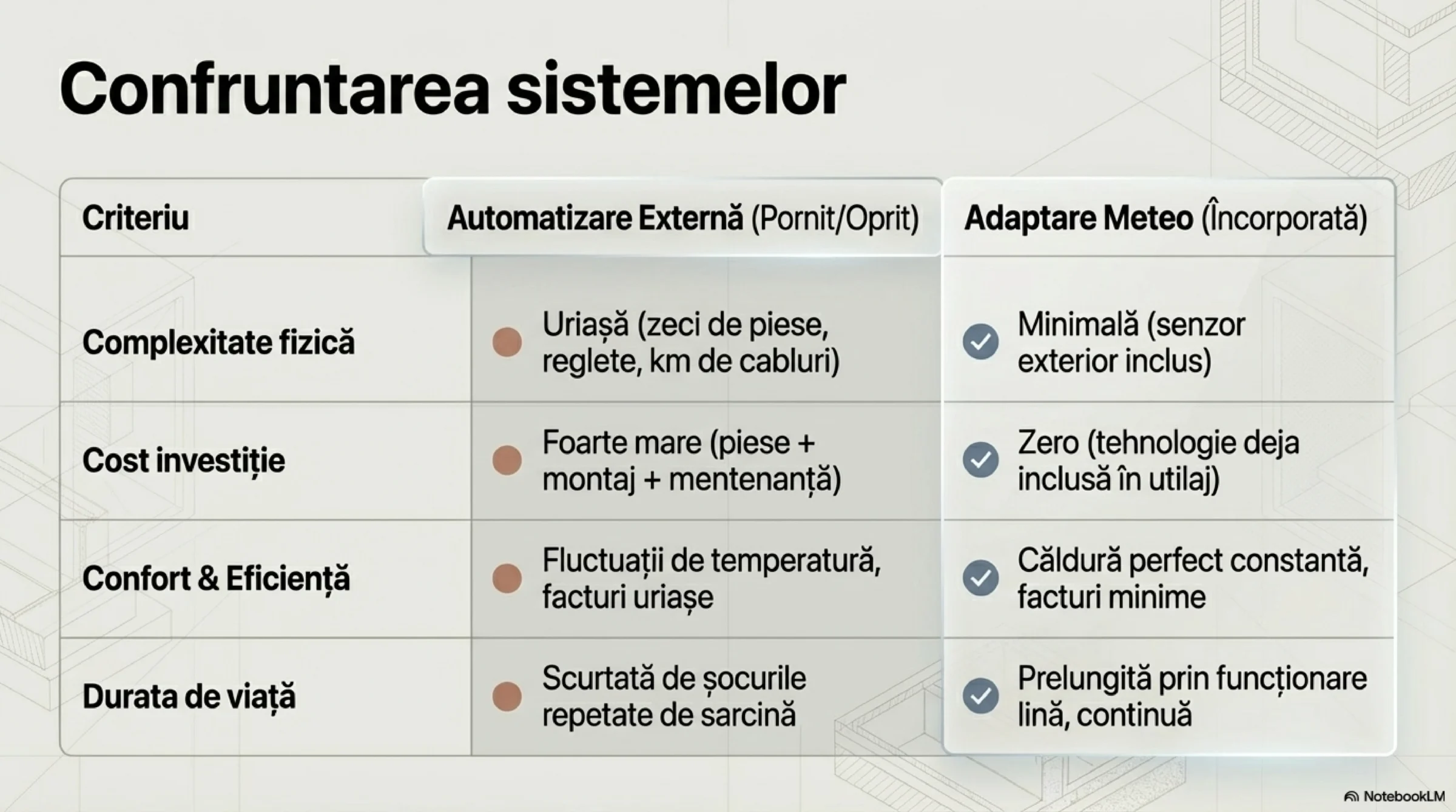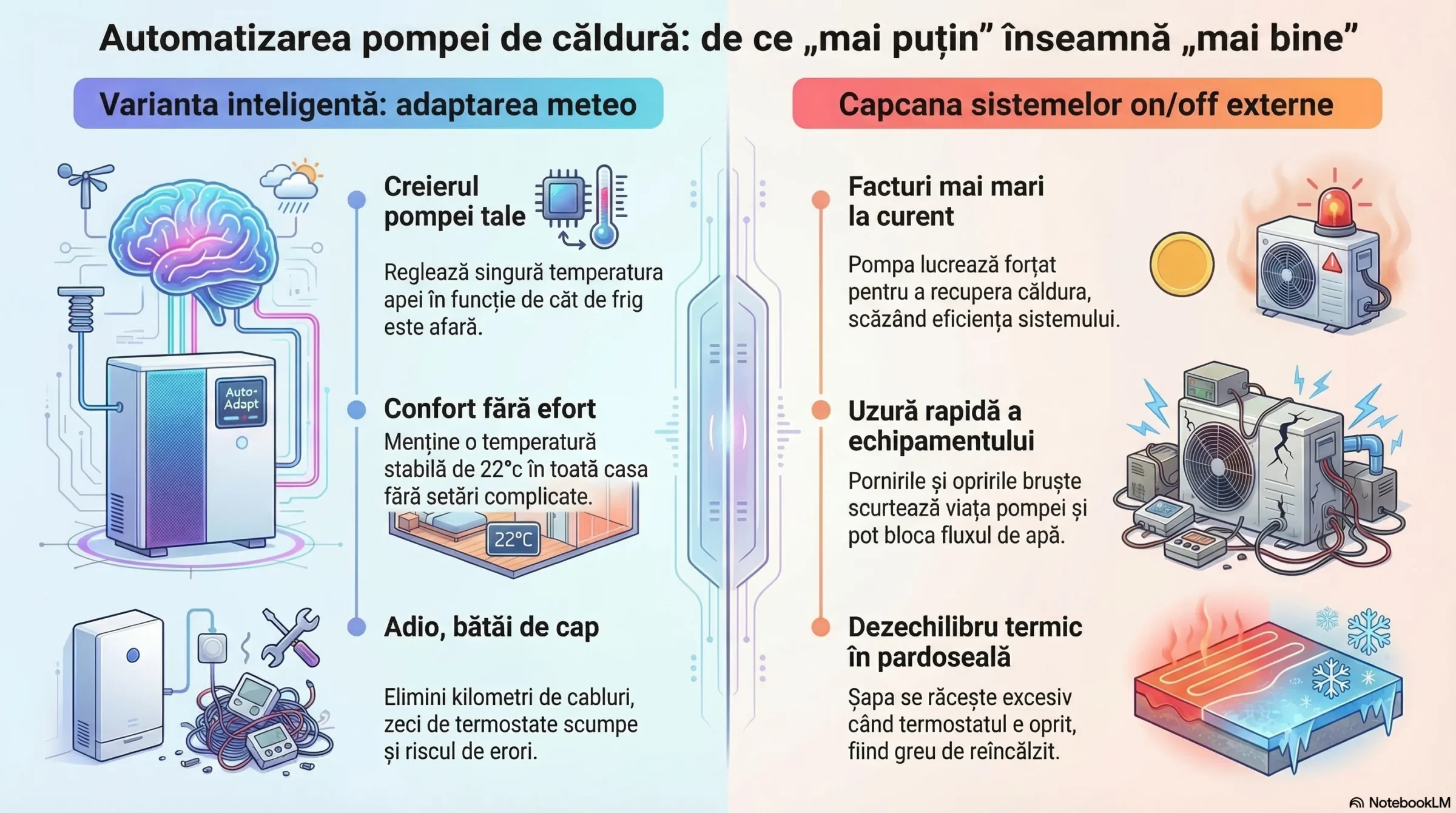 Paradoxal, majoritatea utilizatorilor (și, adesea, instalatorilor) refuză să profite de automatizările interne, net superioare, ale utilajelor. În schimb, preferă să apeleze la sisteme de automatizare externe bazate pe principiul brut ON/OFF (mărci consacrate pe piață precum Rehau, Uponor, Salus, Honeywell etc.). În această configurație, pompa de căldură este, de cele mai multe ori, „castrată” tehnologic și setată să livreze apă la o temperatură fixă și mare, de 55–65°C.