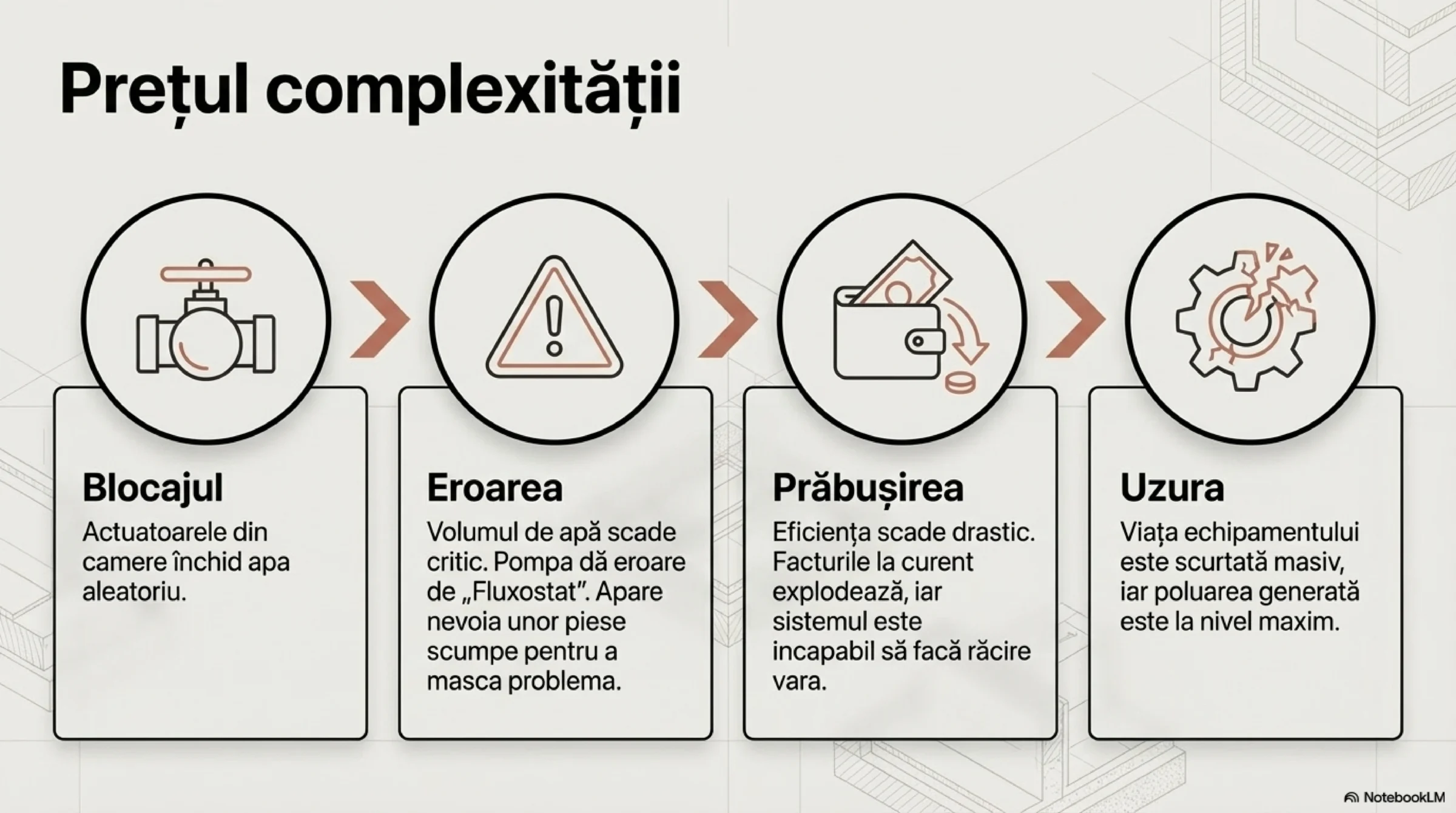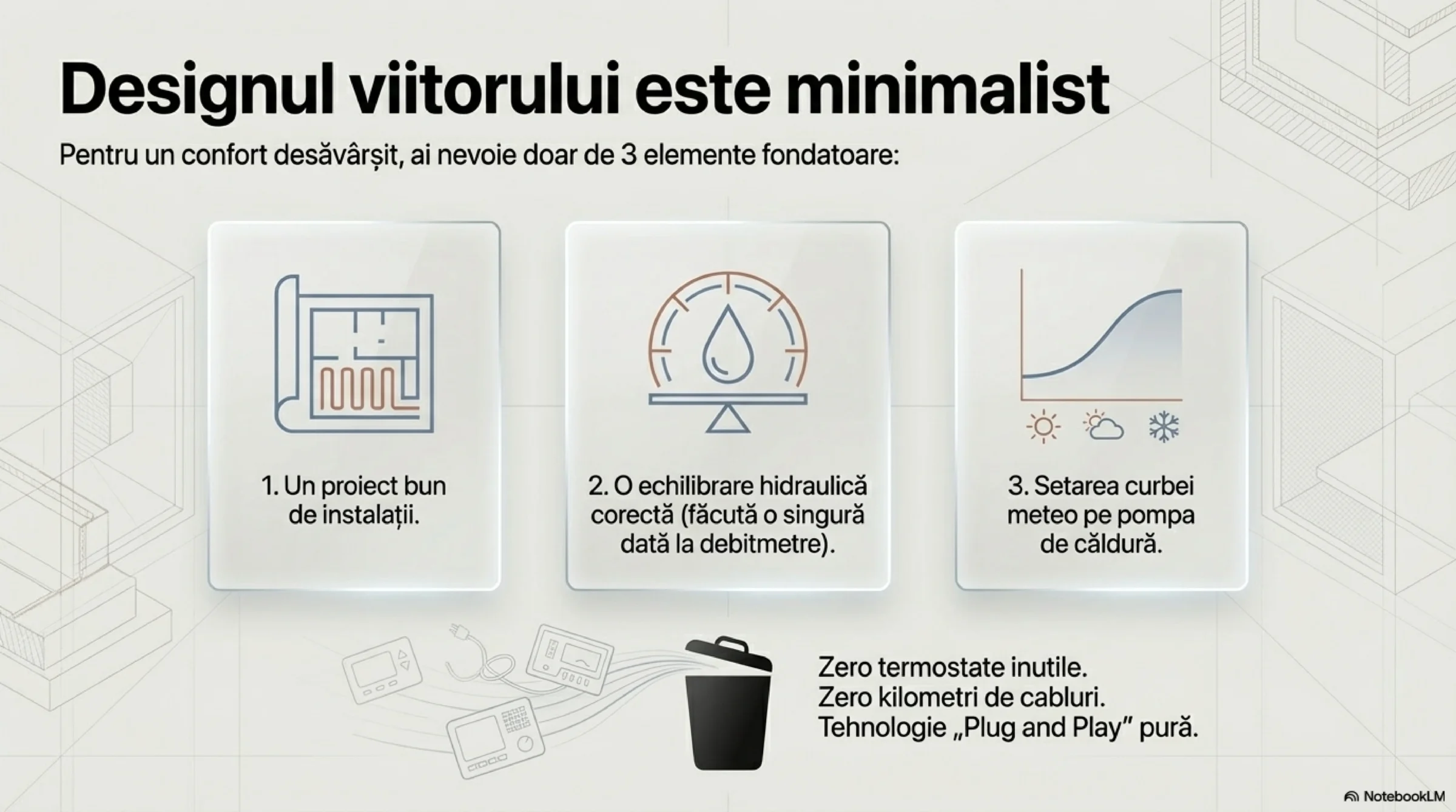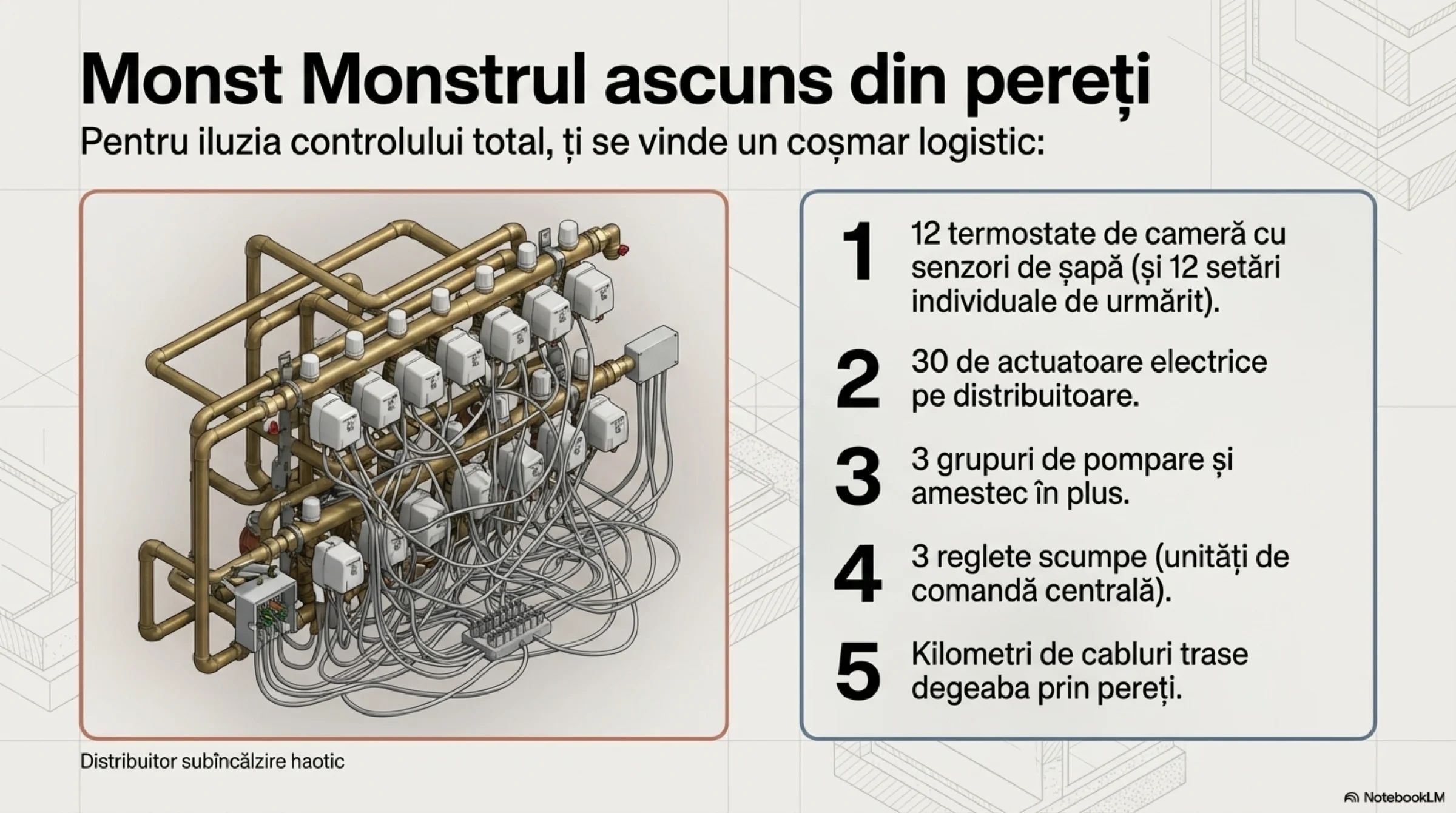 Este un fapt cert că ingineri, instalatori și beneficiari deopotrivă concep încălzirea în pardoseală ca fiind, din start, plină de termostate Wi-Fi, ecrane pe fiecare perete, reglete în cutia distribuitorului și zeci de actuatoare. Însă realitatea fizicii termiceTERMICE = instalații termice (încălzire și răcire) demonstrează că o astfel de automatizare ON/OFF, extrem de scumpă la achiziție, vine la pachet cu:
