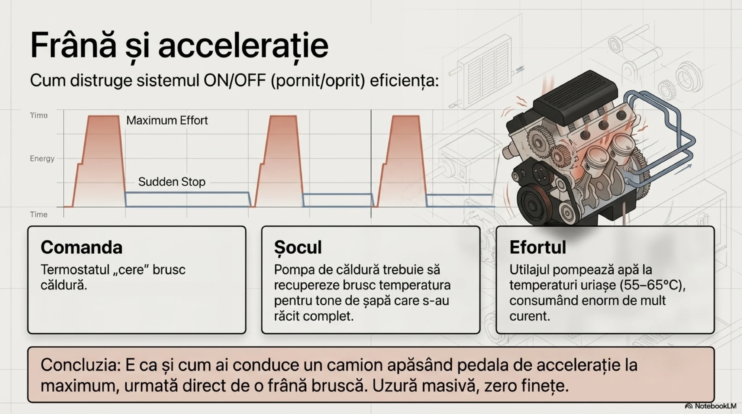 Problema majoră apare pe ger. În momentul în care termostatul dă comanda de recuperare a temperaturii (de exemplu, de la 21°C la 22°C), pompa de căldură are de îndeplinit brusc două sarcini masive: