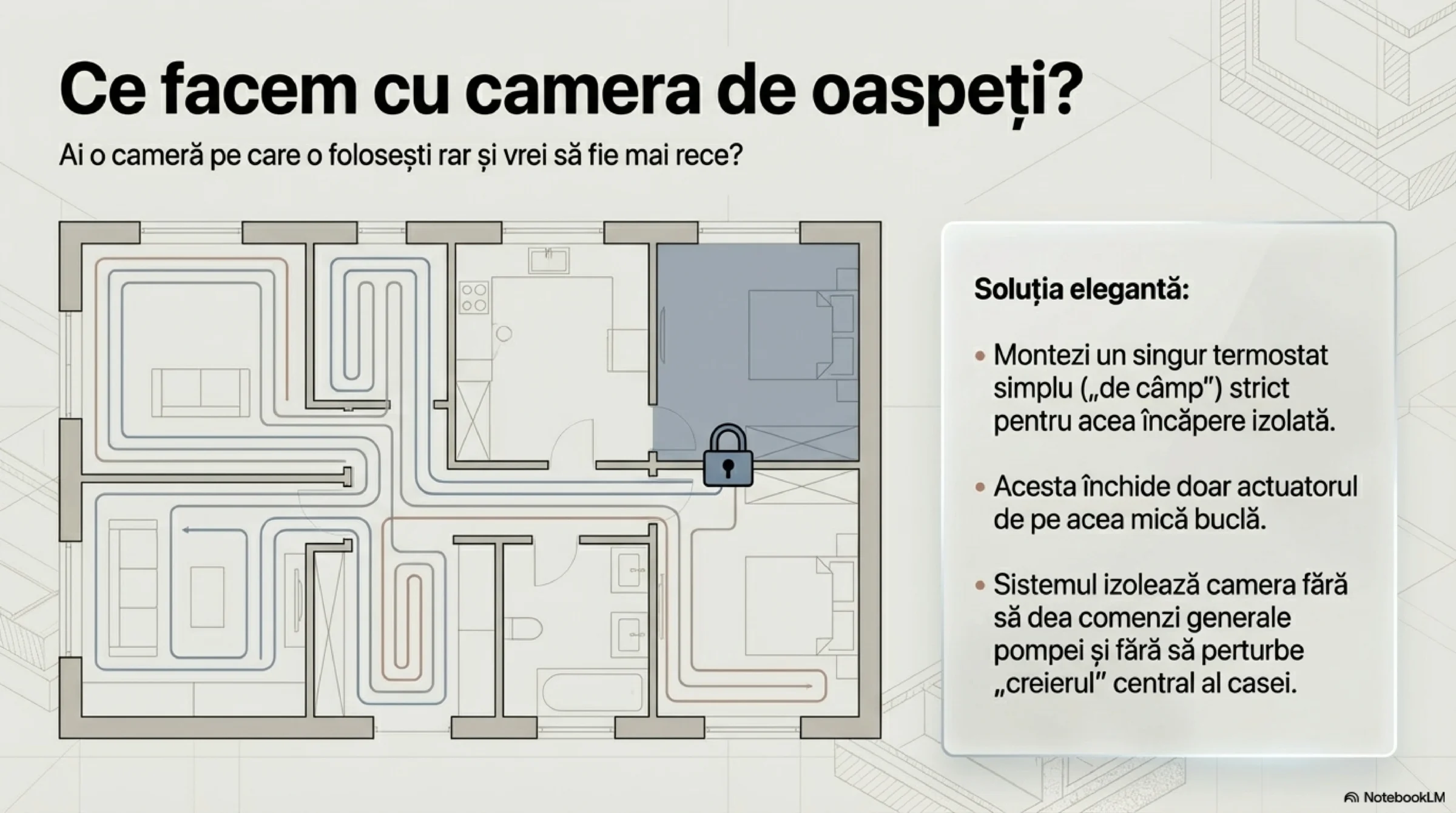 Recomandarea tehnică: Sugerăm folosirea automatizării proprii a pompei de căldură pentru a menține o temperatură stabilă în toată zona locuită a casei (fără niciun termostat general). Pentru camerele folosite rar (ex: un dormitor de oaspeți), se poate aplica soluția unui termostat „de câmp” – acesta acționează strict un actuator pe bucla respectivă, fără să aibă vreo legătură de comandă cu pompa de căldură.