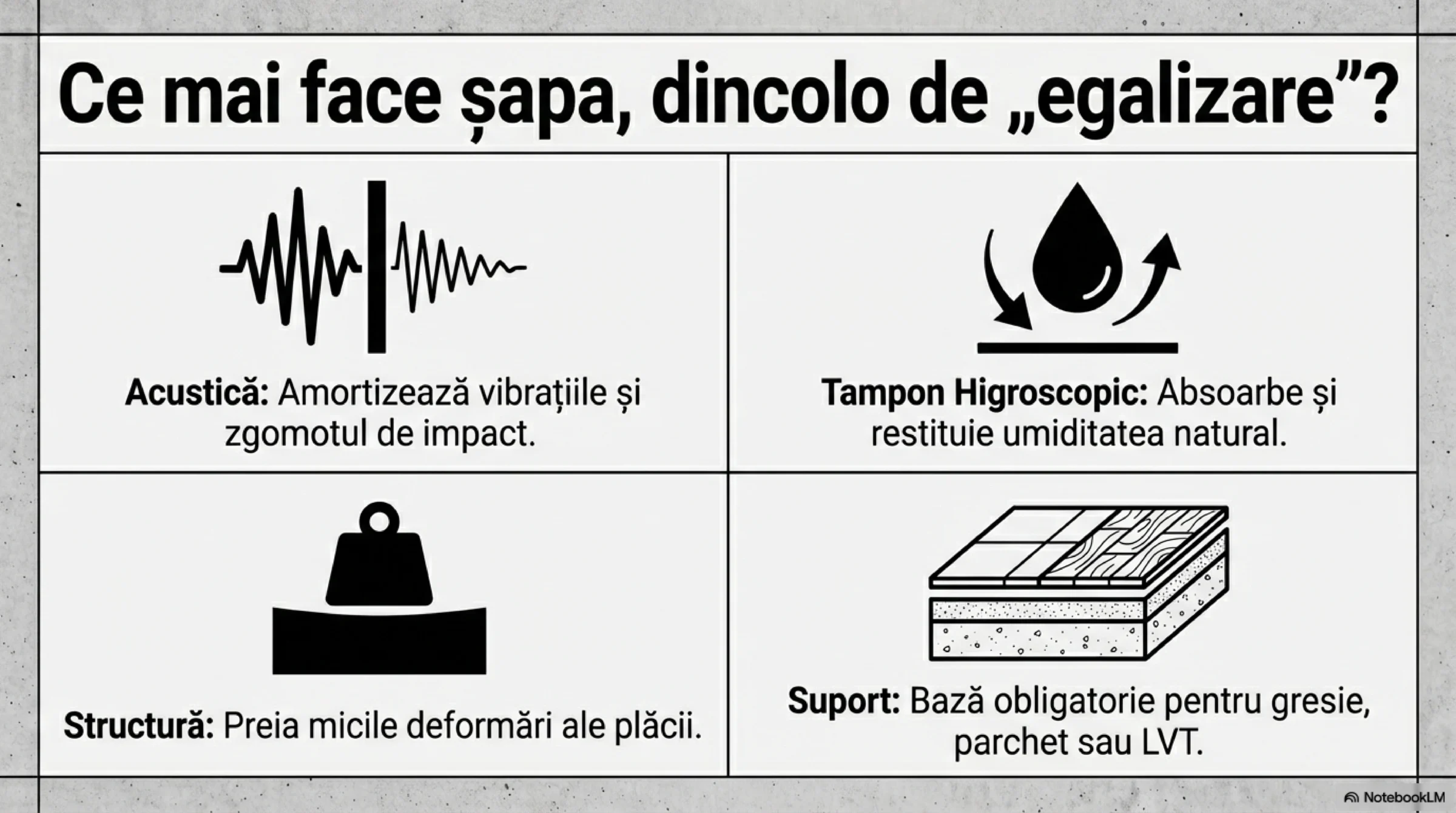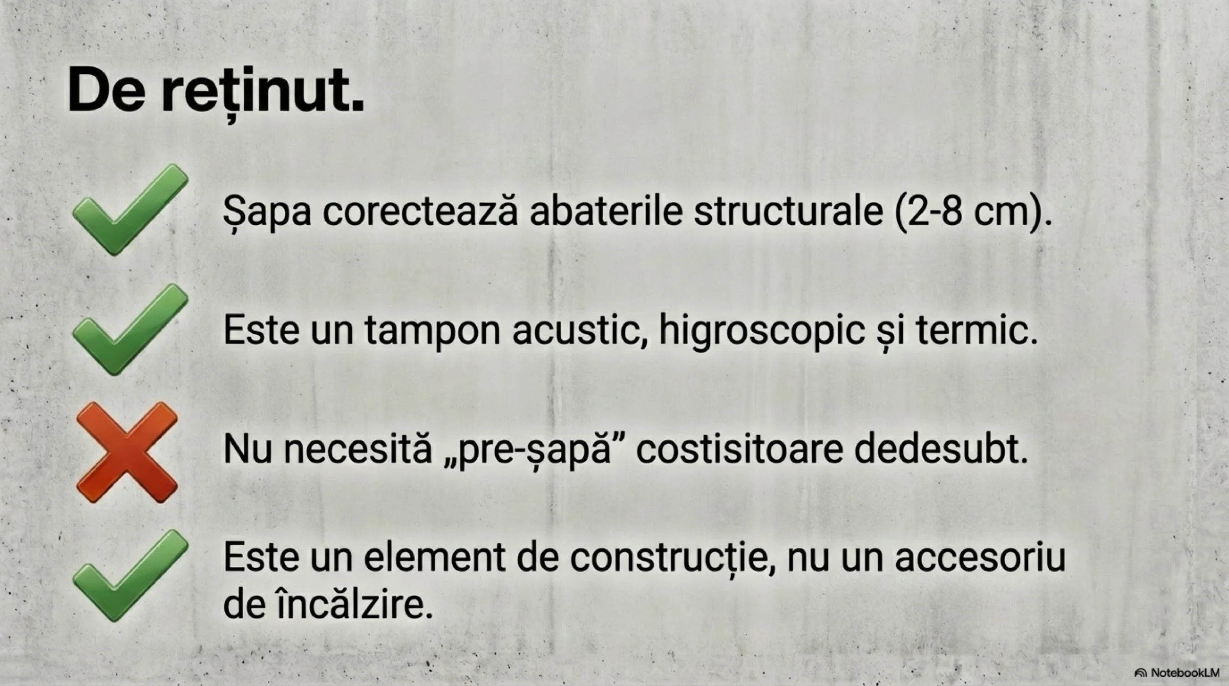 - constituie suport pentru finisaje (gresie, parchet, LVT, SPC etc.).