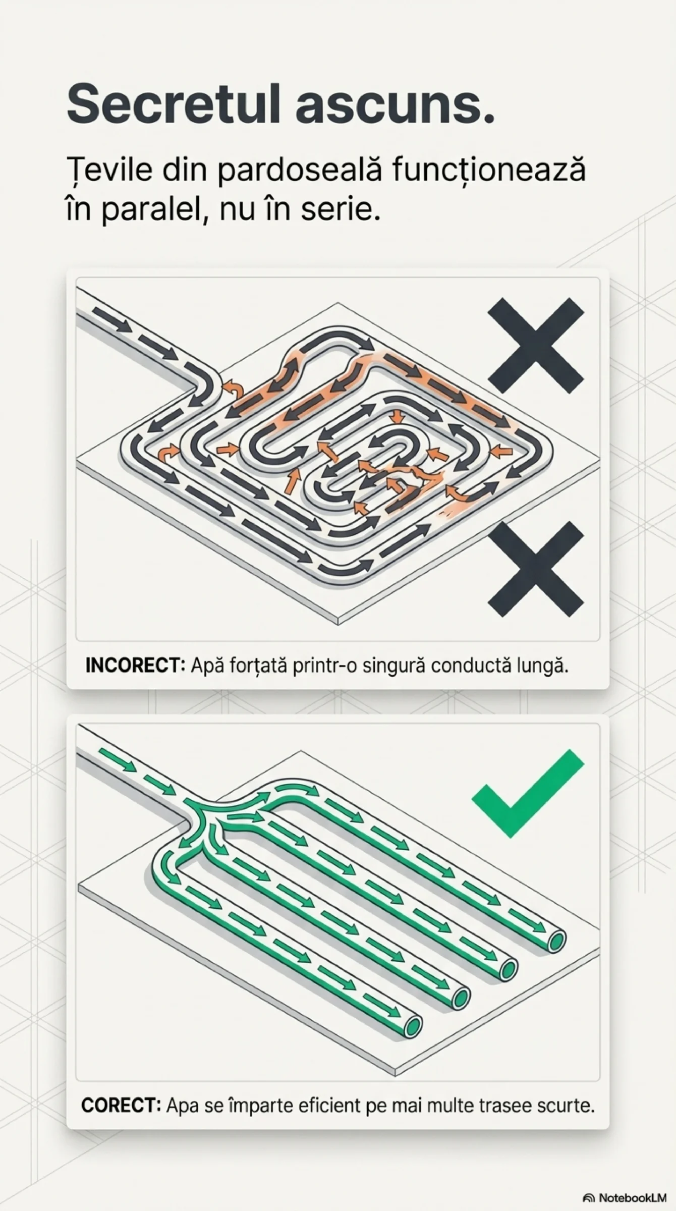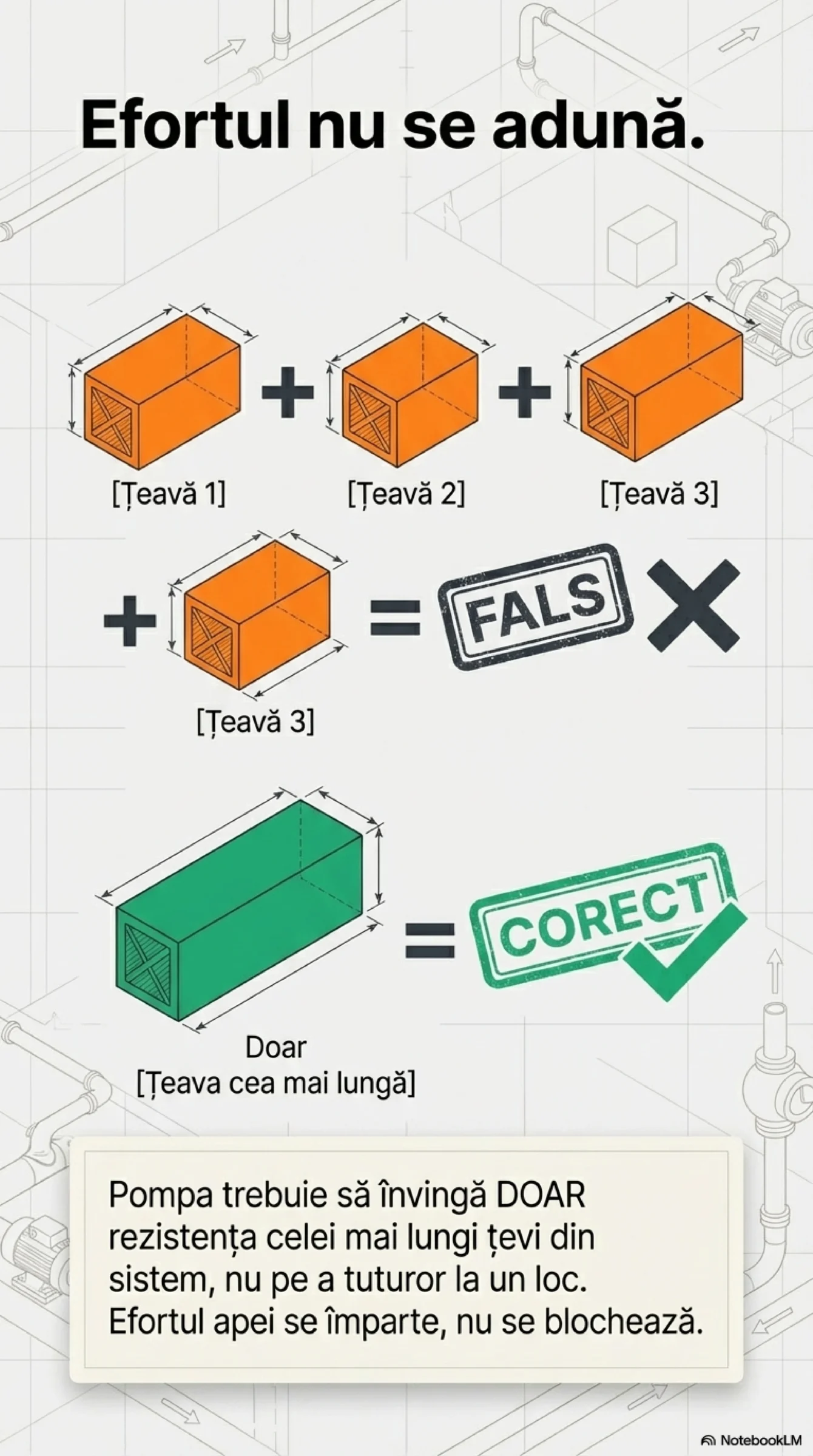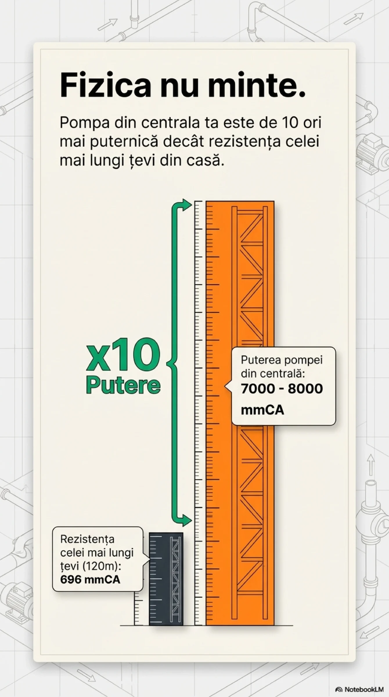 Este o afirmație gratuită, aruncată la unison de instalatori, ingineri de service sau vecini binevoitori, dar care nu este susținută de absolut niciun calcul hidraulic. Nici măcar o urmă de curiozitate tehnică legată de pierderi de sarcină liniare, viteze economice sau rugozitatea conductelor.