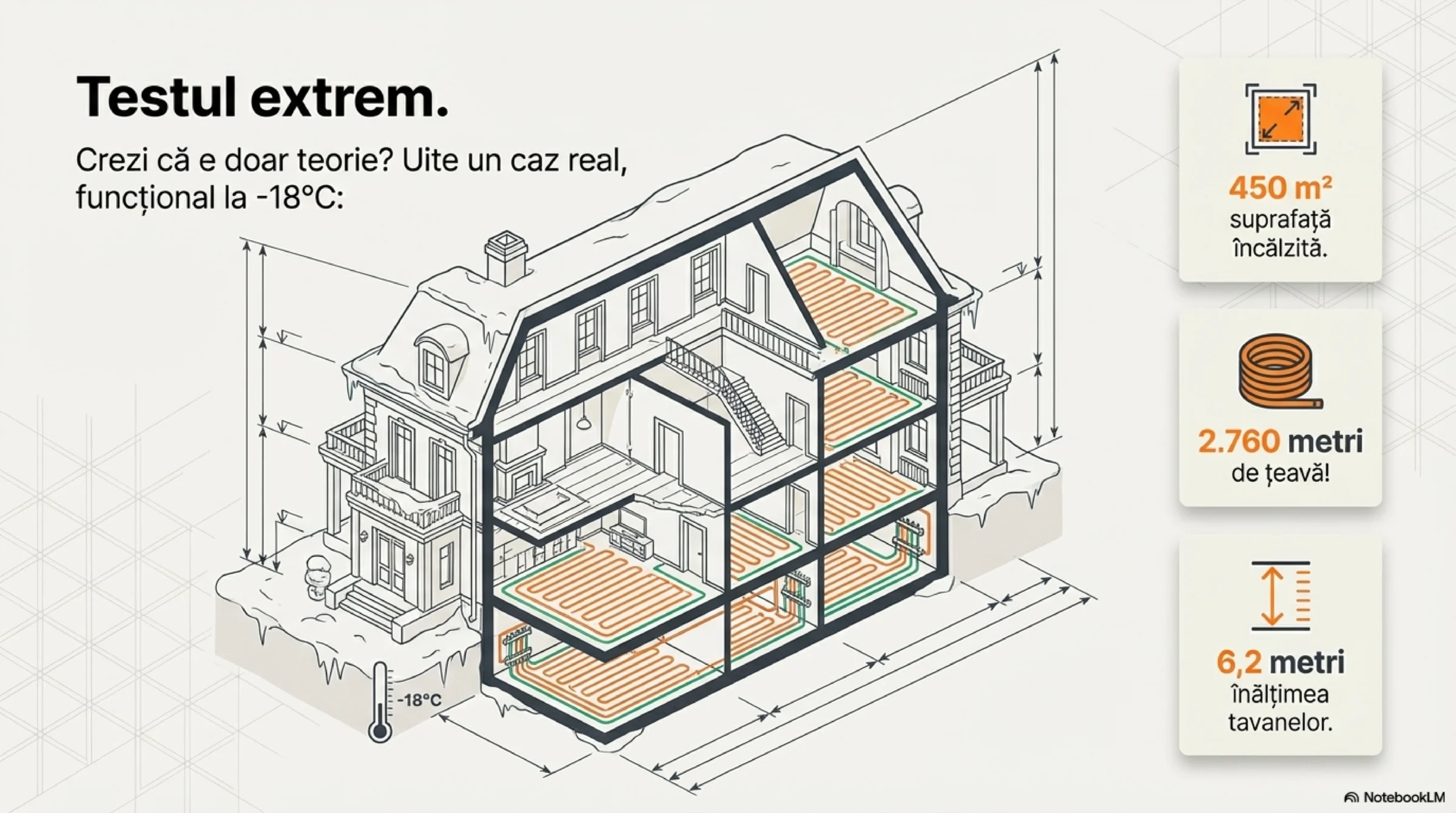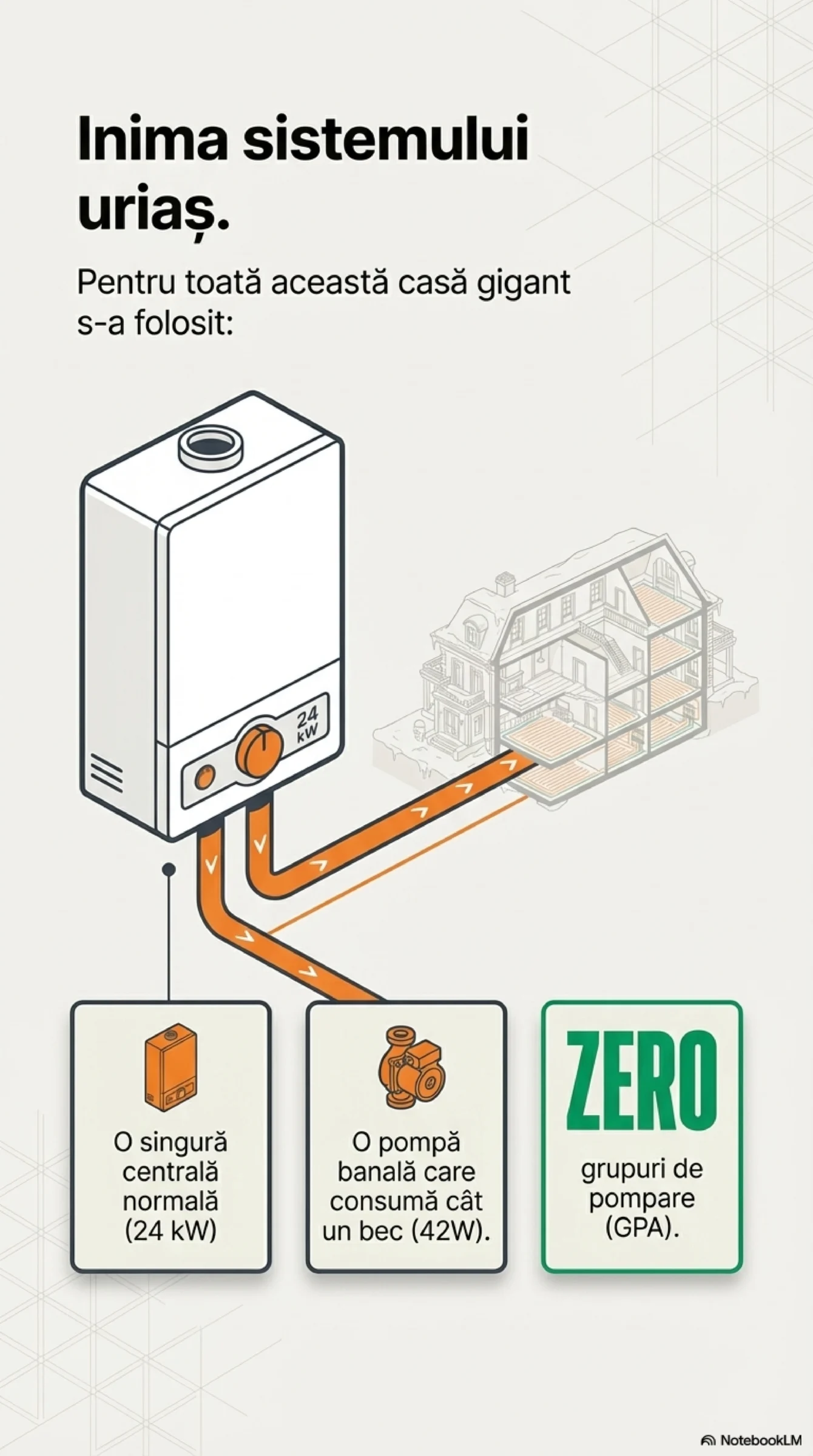 Realitatea din teren: 450 m² utili încălziți de pompa unei centrale de 24 kW (fără GPA)