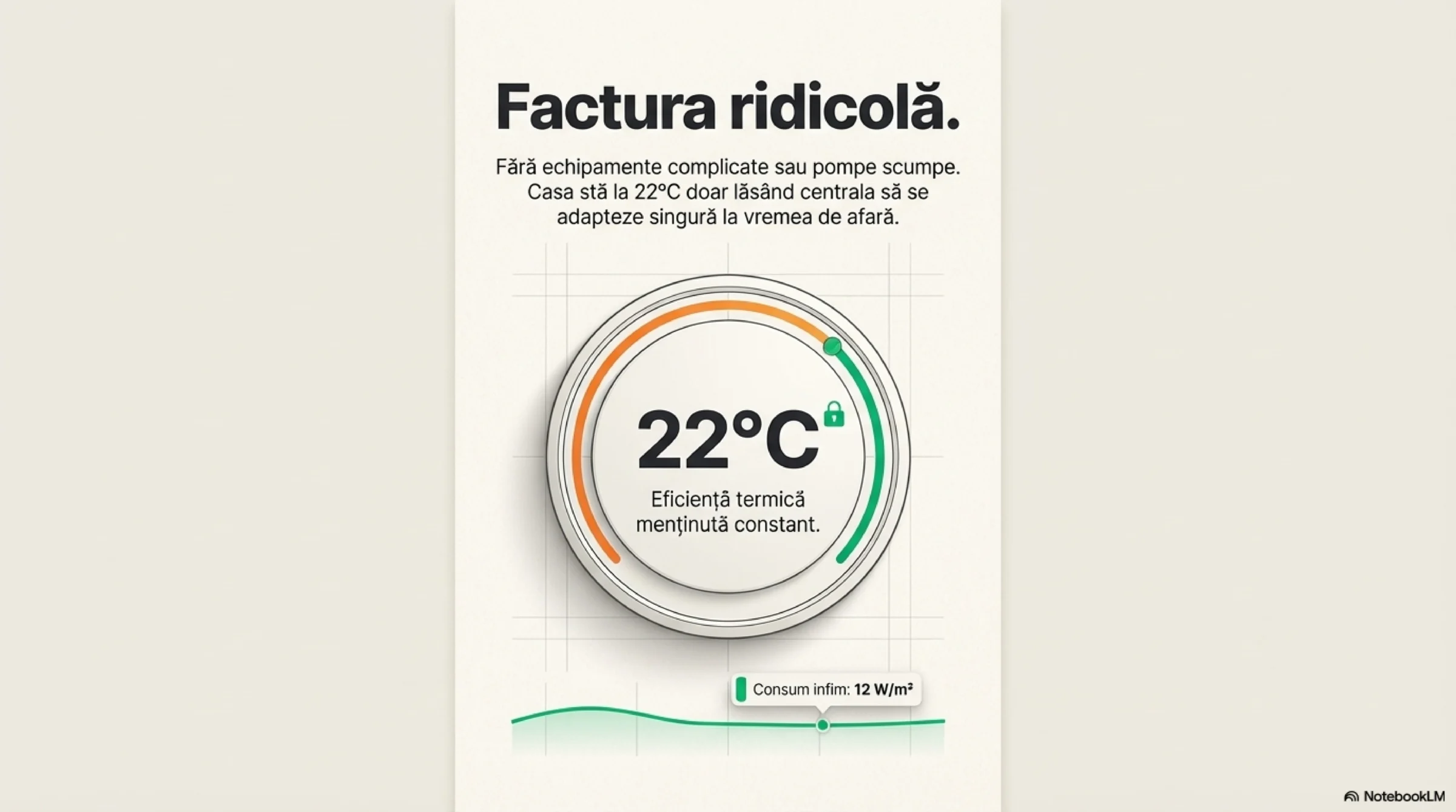 Rezultatul? În luna ianuarie 2022, factura de gaz a fost infimă, echivalentul unui consum de 12 W/m² (încălzire + apă caldă menajeră). Casa este menținută la 22°C exclusiv prin adaptare meteo (centrala reglează singură temperatura apei în funcție de frigul de afară). Termostatele „smart” de pe pereți au rol doar de design, ele neavând ocazia să închidă vreodată sistemul pentru că temperatura rămâne constantă.