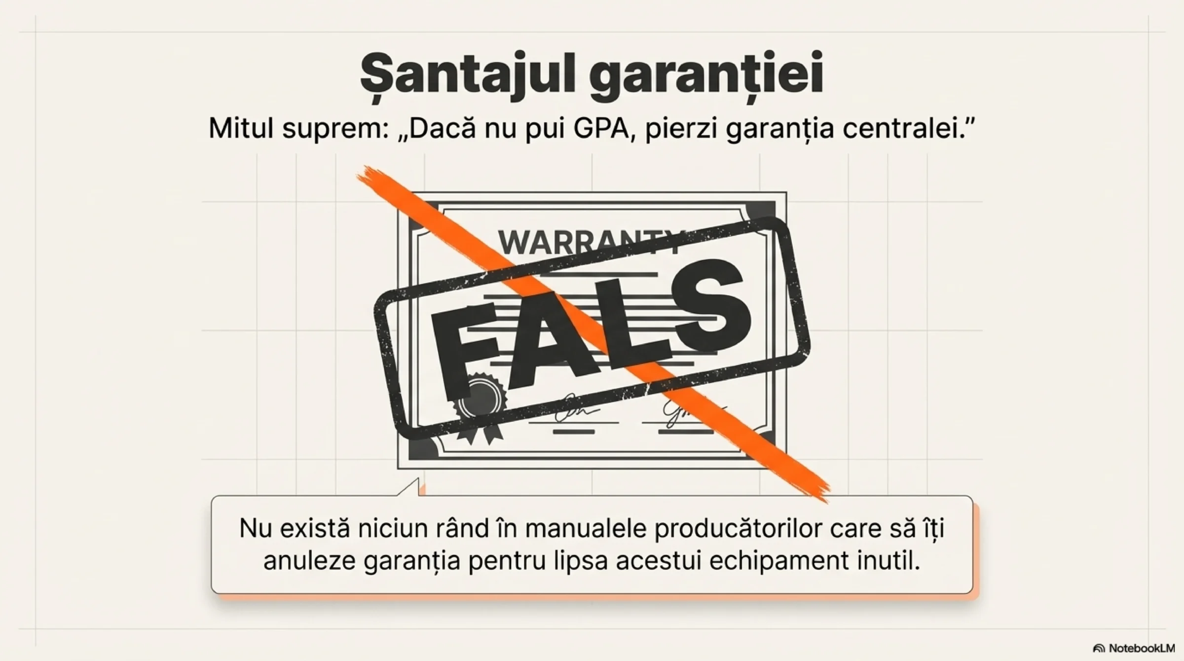 Acesta este probabil cel mai ridicol mit lansat de inginerii de service comozi. Garanția centralei termice sau a pompei de căldură NU este condiționată de folosirea unui grup de pompare. Nu există niciun rând în certificatele de garanție sau în manualele de instalare (indiferent de marcă) care să specifice că „nu se acordă garanție fără GPA”.