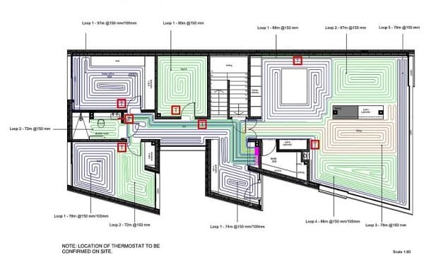 Pentru proiect încălzire în pardoseală cu agent termic, nu folosim niciun [program] underfloor heating software, niciun LoopCad. În spatele lor sunt ingineri de instalații. Ca noi. Să ne spunem old school. De aceea să funcționeze instalațiile noastre? Bine, în România, proiectare = obținere avize, proiect încălzire = desene color în PDF și o listă cu: plăci cu nuturi, 3 grupuri de pompare amestec, o butelcuță de egalizare, 8 senzori de șapă.