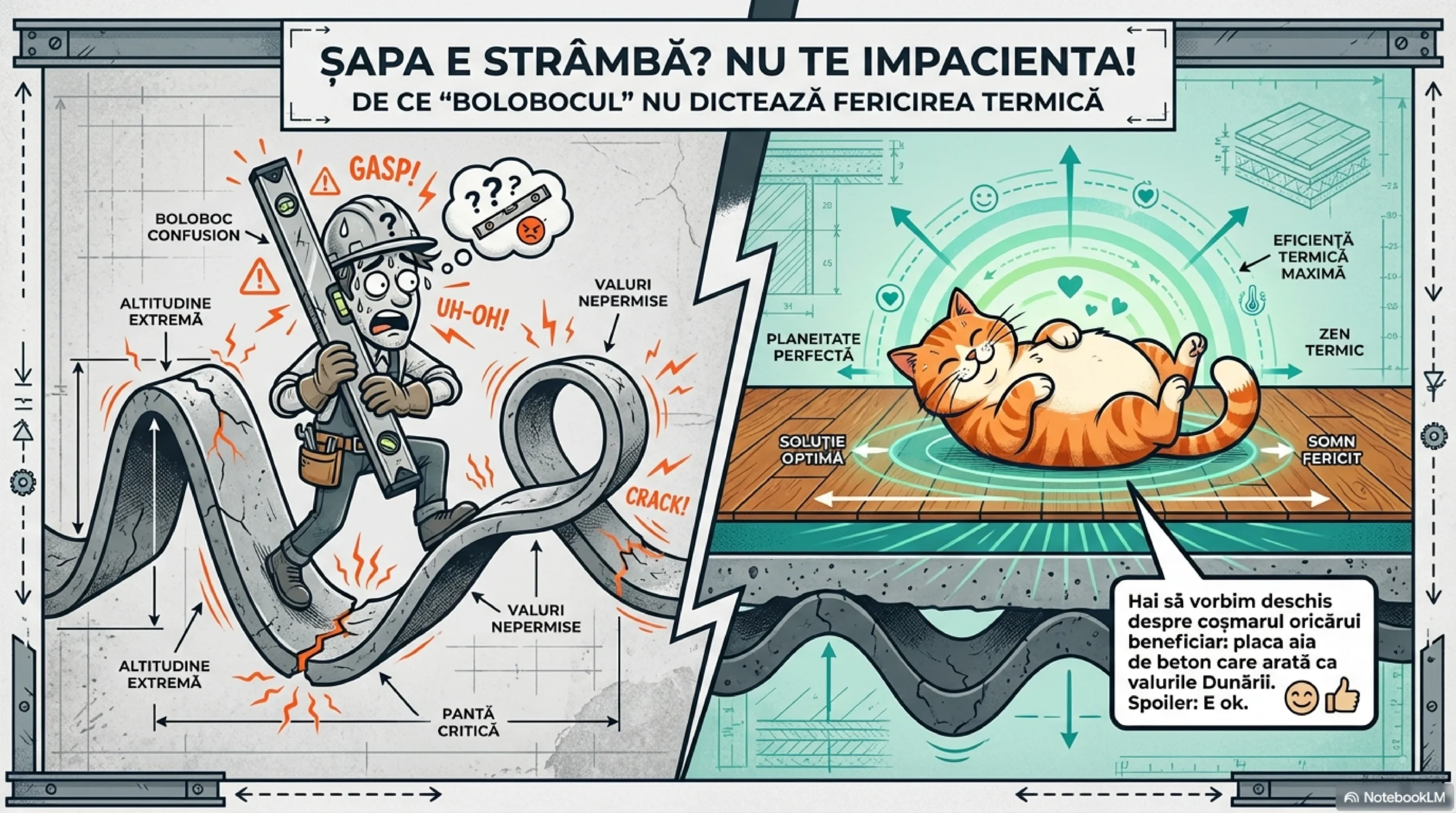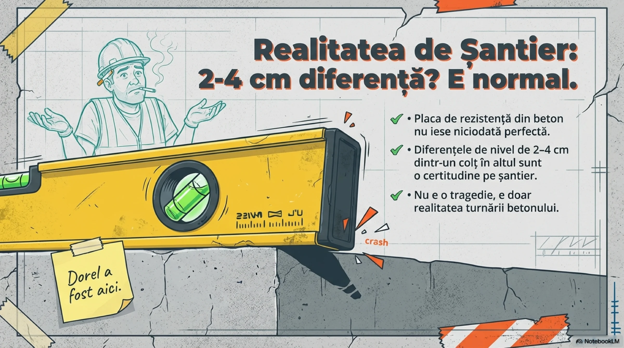 Placa de rezistență din beton nu iese niciodată perfect „la boloboc”. Este o realitate pe orice șantier. Când apar diferențe de nivel de 2–4 cm dintr-un colț în altul al camerei, apare și panica beneficiarului: