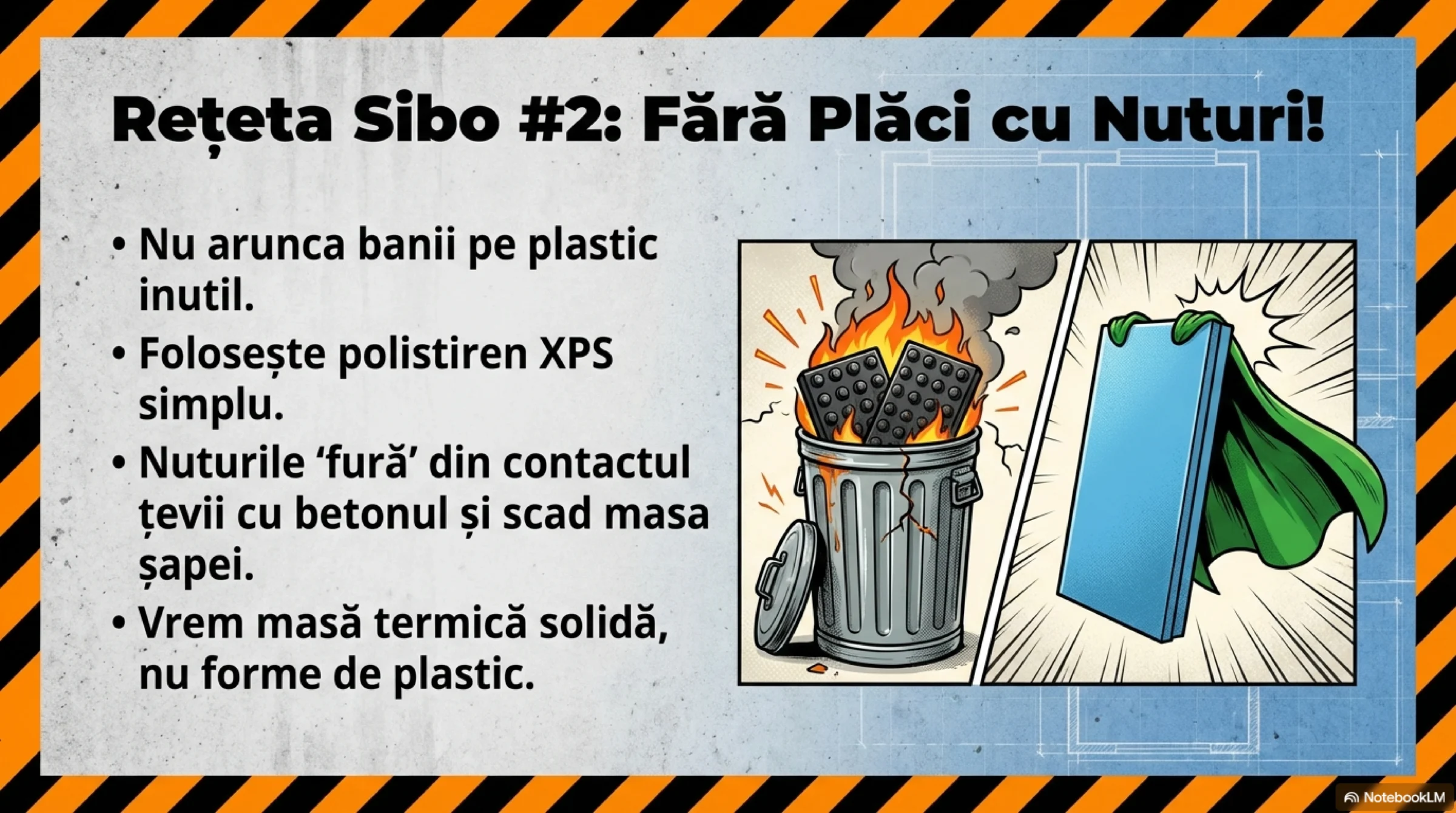 - Fără plăci cu nuturi: Folosiți polistiren XPSXPS = polistiren extrudat simplu. Nuturile fură din contactul țevii cu șapa, fură din volumul de beton, scad greutatea șapei și, implicit, îi „mutilează” inerția termică. (XPS vs plăci cu nuturi)