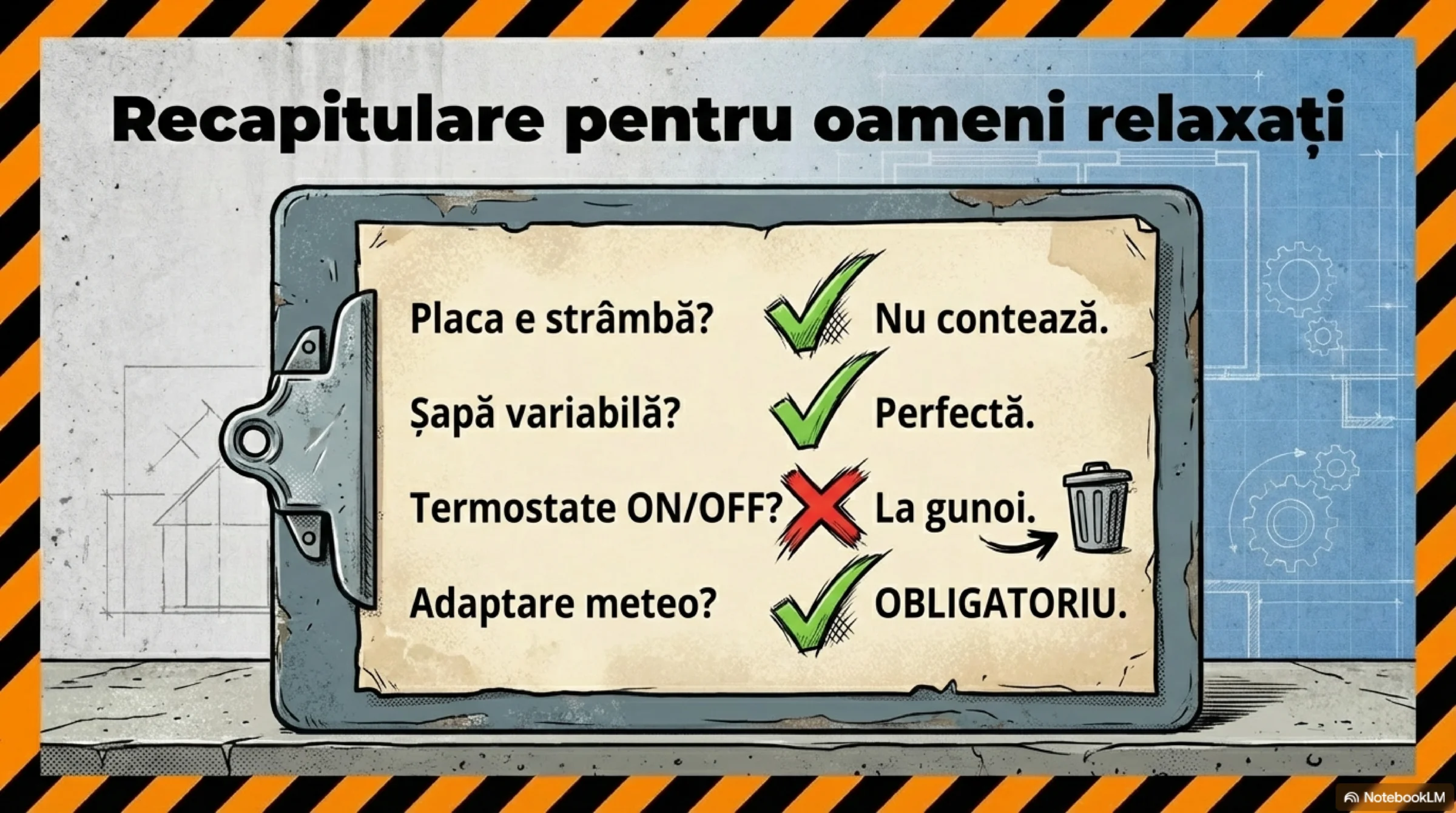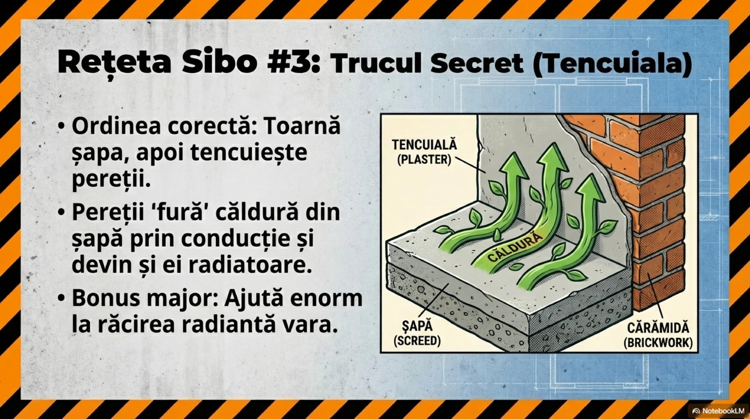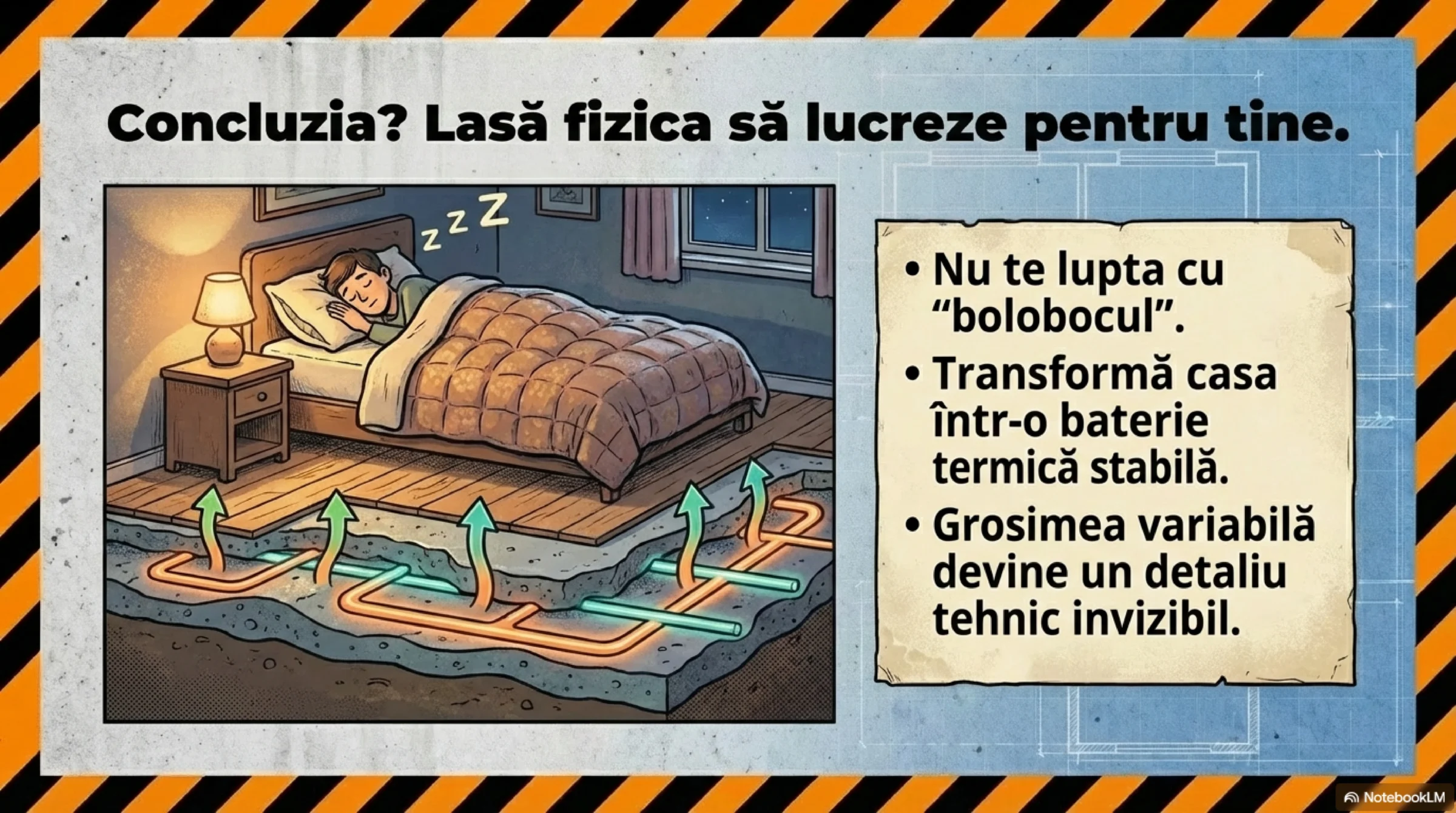 - Șapă cât mai groasă: Cât permite structura. Inerție termică mare înseamnă stabilitate și „baterie termică”—utilă în diminețile geroase și după mesele toride.