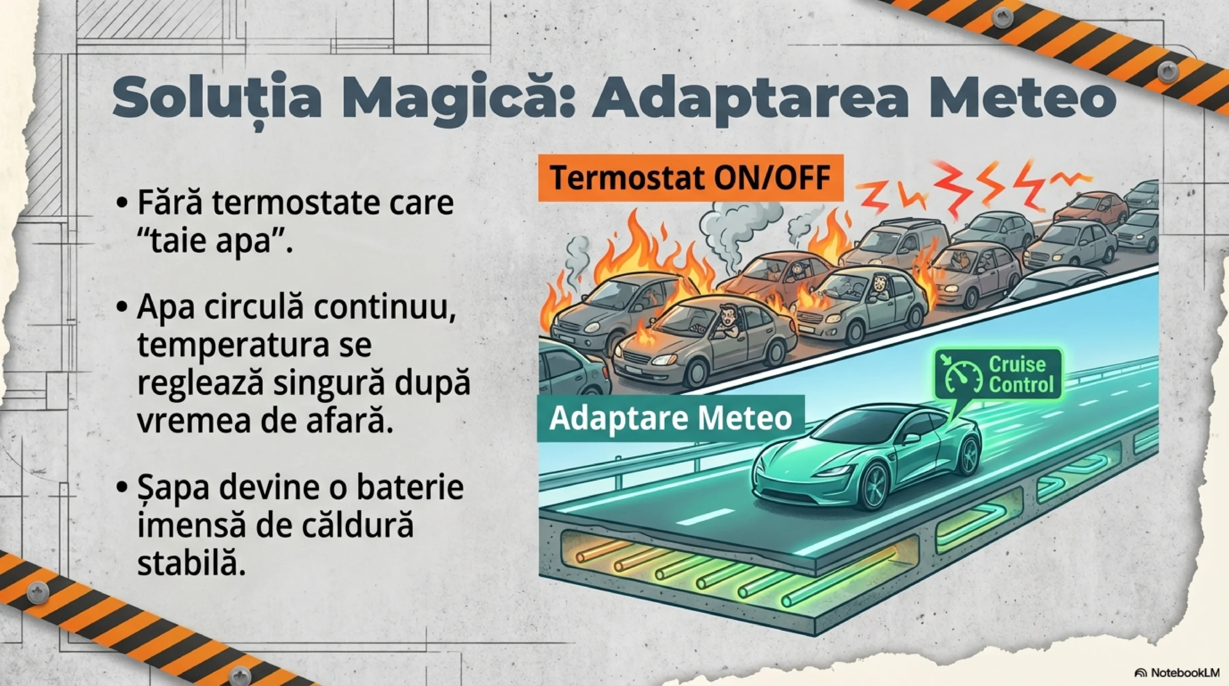 Soluția simplă? Adaptarea meteo. Fără termostate care „taie apa”, fără actuatoare. Agentul termic circulă continuu, compensat strict în funcție de vremea de afară. Șapa devine o baterie termică stabilă, iar grosimea ei variabilă devine un detaliu uitat sub parchet.