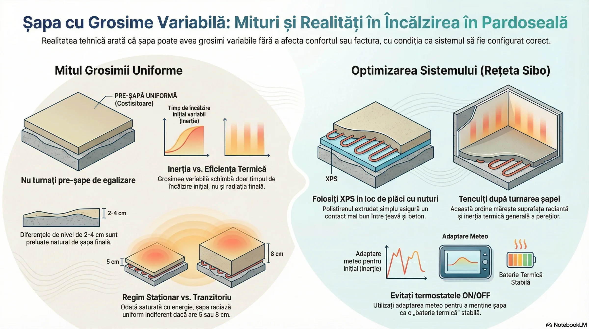Mulți cred că dacă șapa are 5 cm într-o parte a camerei și 8 cm în cealaltă, zona mai groasă va fi mereu mai rece. Fals. Grosimea și variațiile de înălțime ale șapei nu influențează relevant calculele termice, nici confortul și nici facturile de încălzire/răcire.