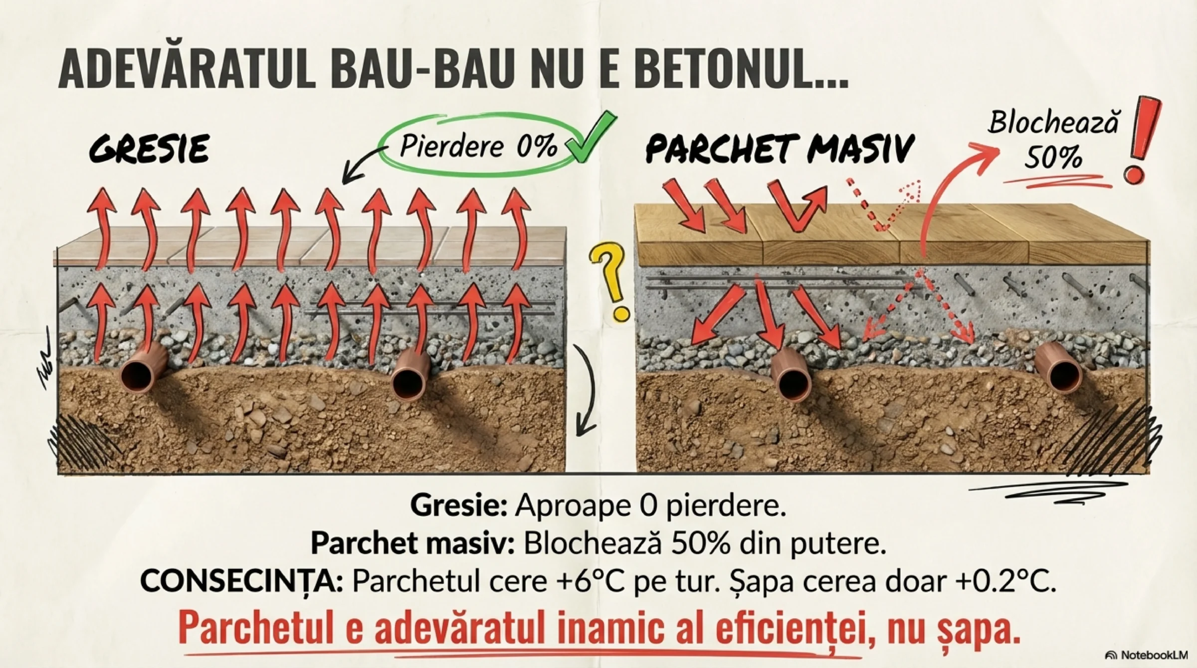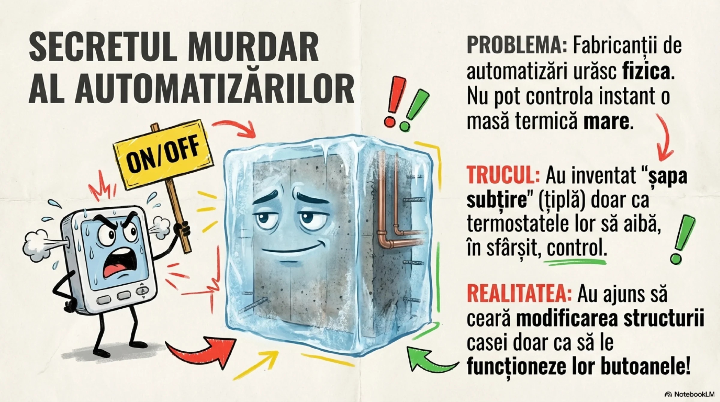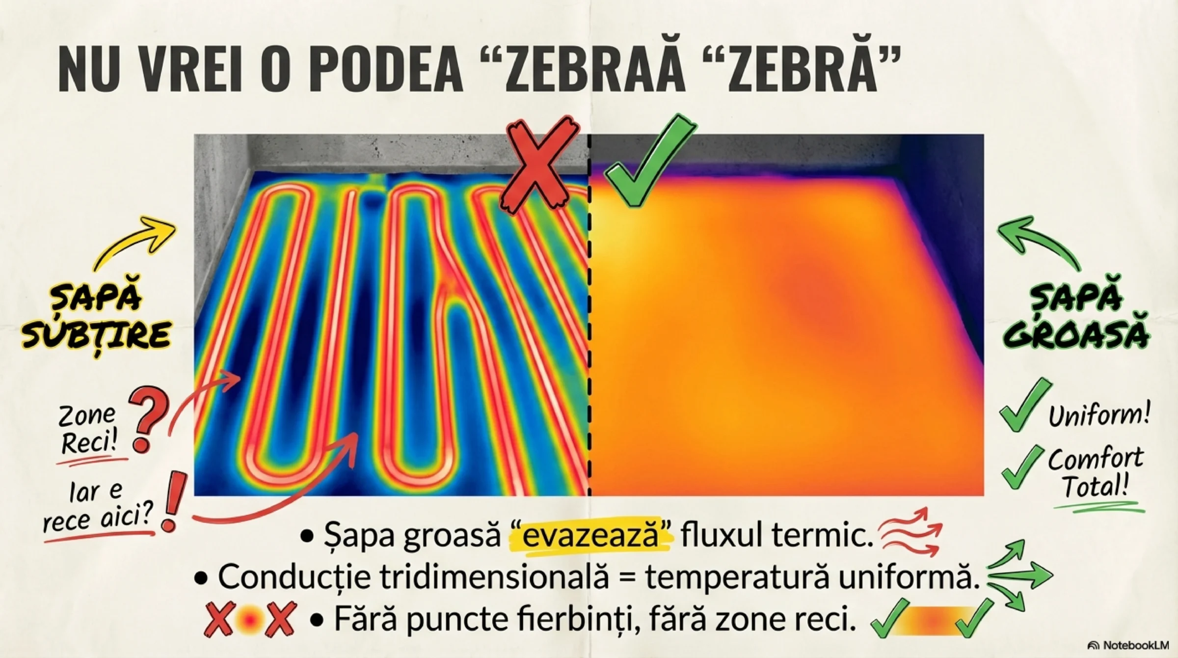 Este de-a dreptul incredibil cum fabricanții de „încălzire în pardoseală” (automatizări), neputând controla nicicum o încălzire în șapă cu masă termică mare — pur și simplu pentru că nu-i lasă fizica — „inventează” și promovează agresiv șapele „țiplă”, super subțiri. De ce fac asta? Doar pentru ca podeaua să piardă orice inerție și să reacționeze cât-de-cât la comenzile lor bruște de pornit/oprit. În loc să adapteze electronica la fizica transferului termic, au ajuns să ceară modificarea structurii casei doar ca să le funcționeze lor butoanele!