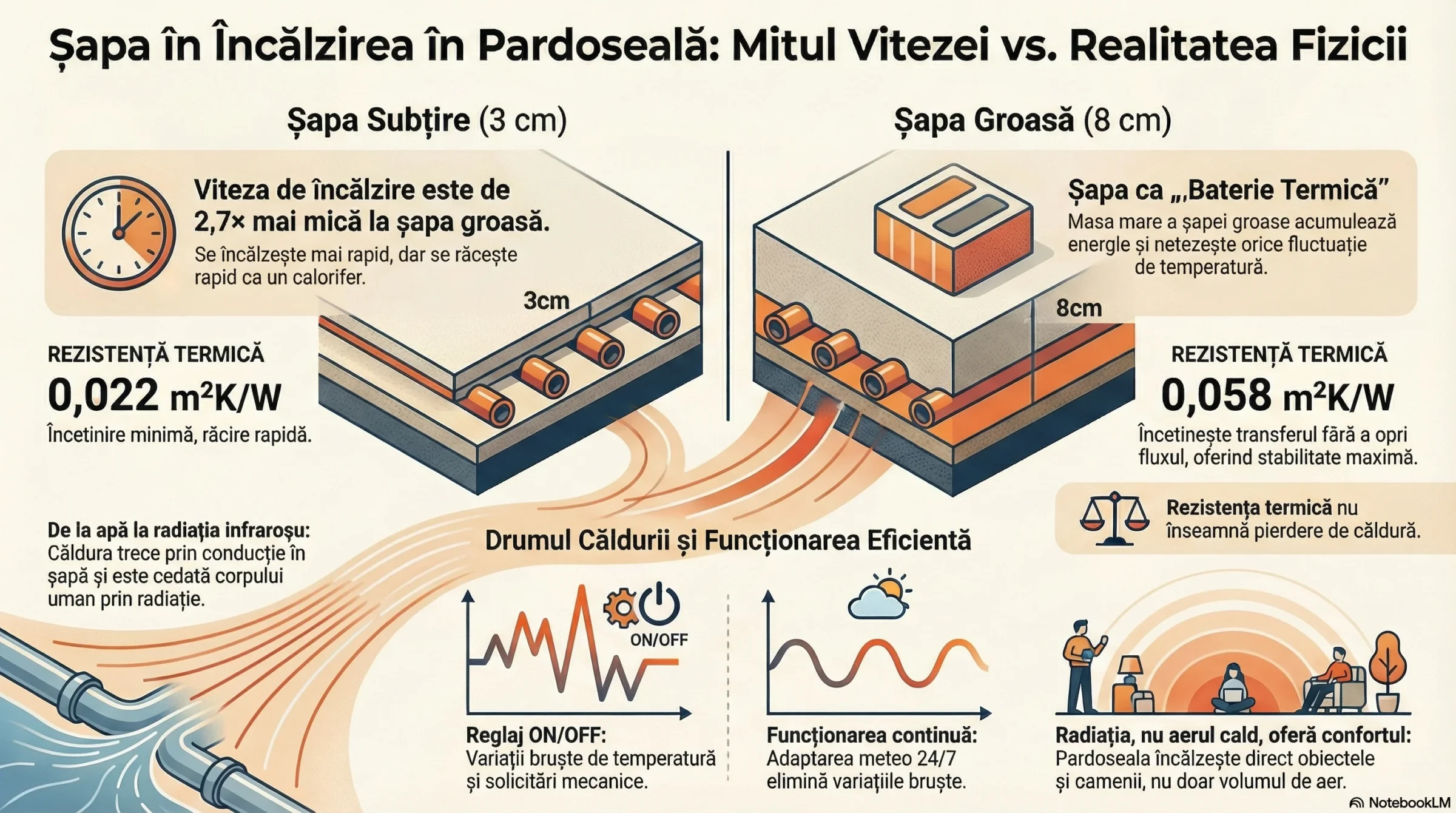 Ok. O șapă groasă are o rezistență termică mai mare (0,058 m²K/W șapă 8cm vs 0,022 șapă 3cm), se încălzește de 2,7× mai lent.