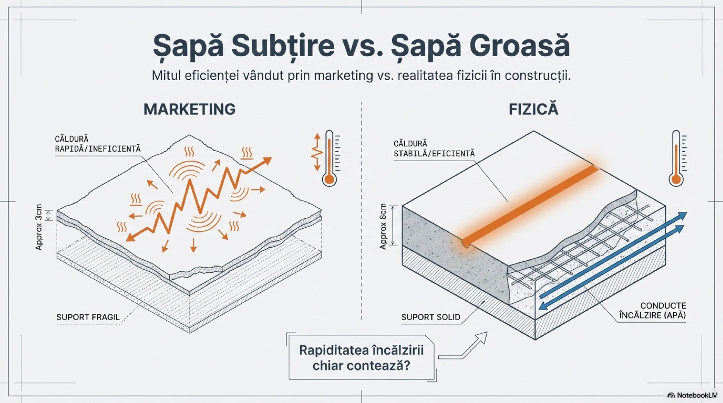 Mulți se sperie pe șantier: Dacă torn șapa de 7-8 cm, căldura nu va mai ajunge la suprafață! Fals. Aici se vede cine înțelege conducția termică și cine nu.