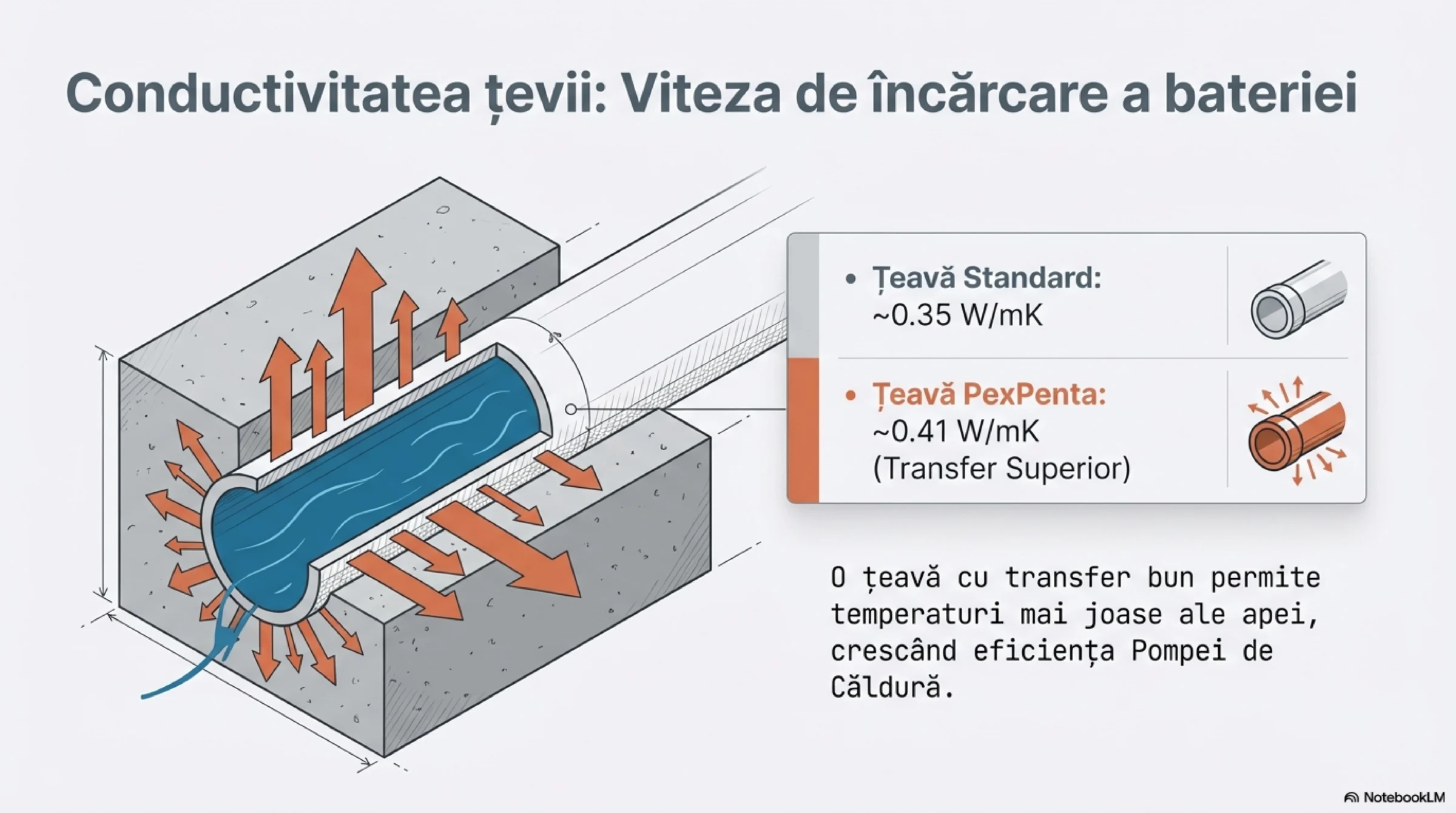 Da. Dar în context. Conductivitate mai mare a materialului țevii înseamnă: