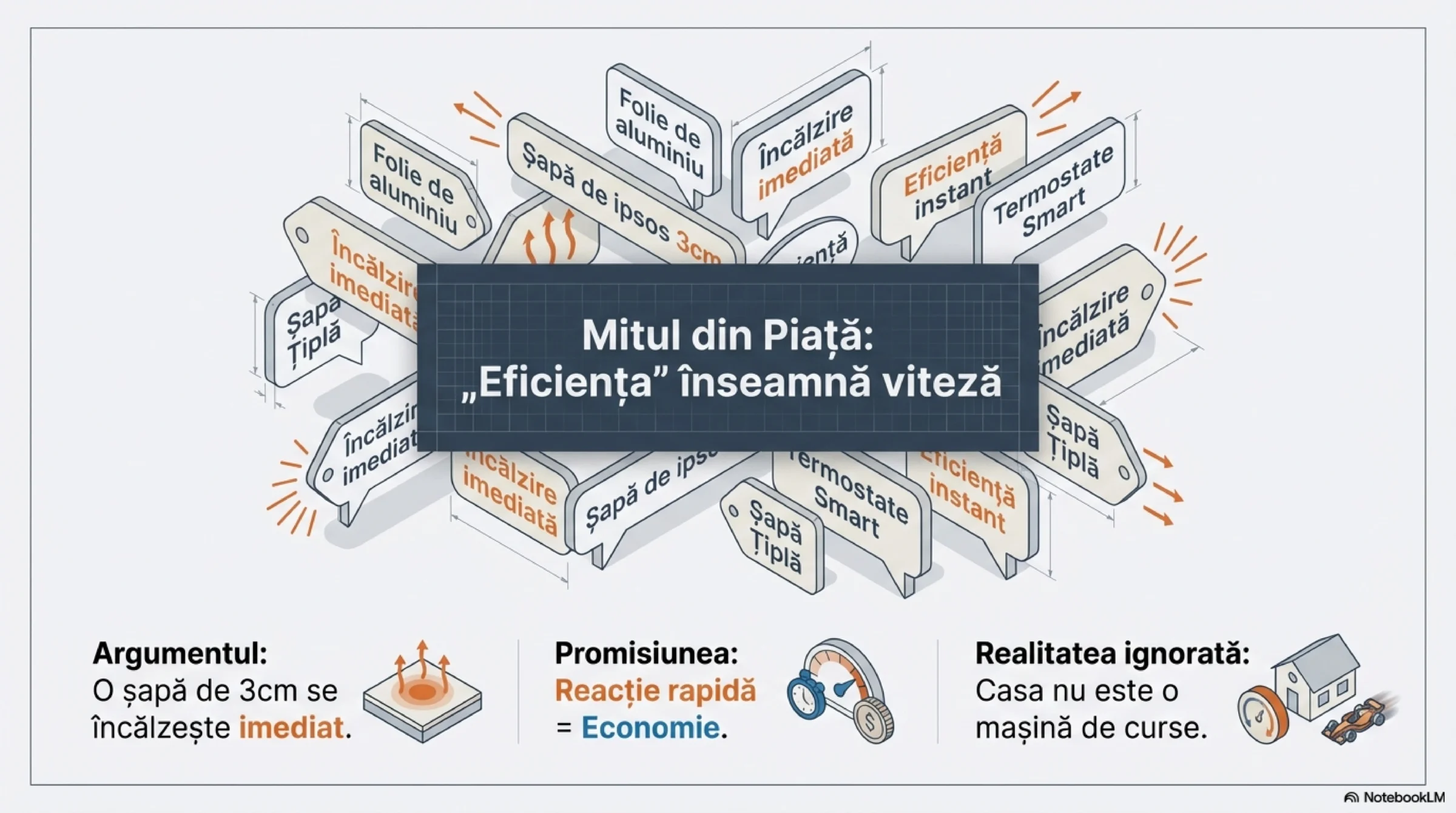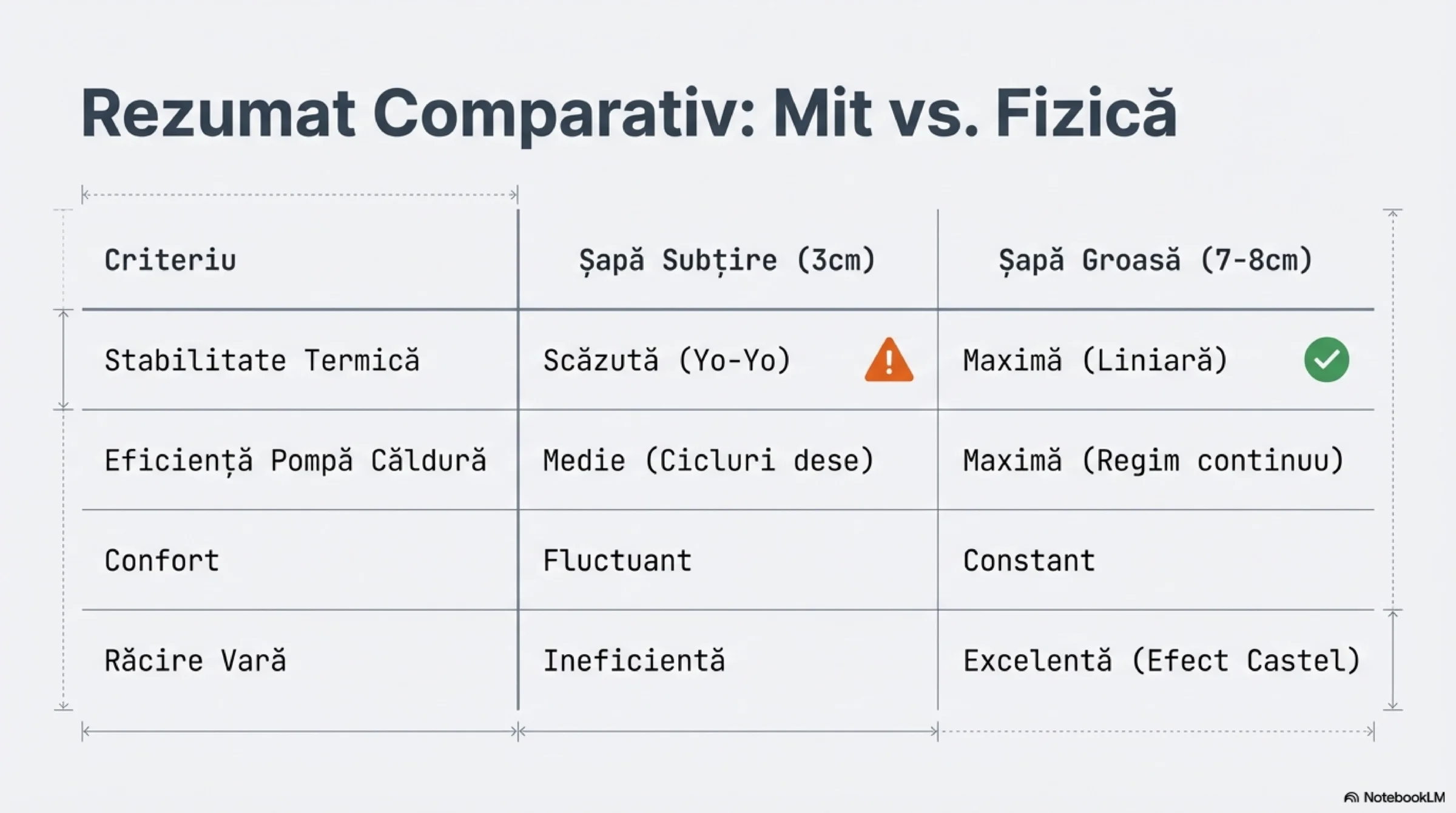 Părerea noastră: Nu e nicio scofală energetică rapiditatea de încălzire! Dragi cititori, dacă veți avea pompă de căldură, contrar internetului, alegeți, alegeți o șapă cât mai groasă, chipurile „cât mai ineficientă”—mai ales pentru răcirea radiantă. Vezi Casa castel versus structură ușoară.