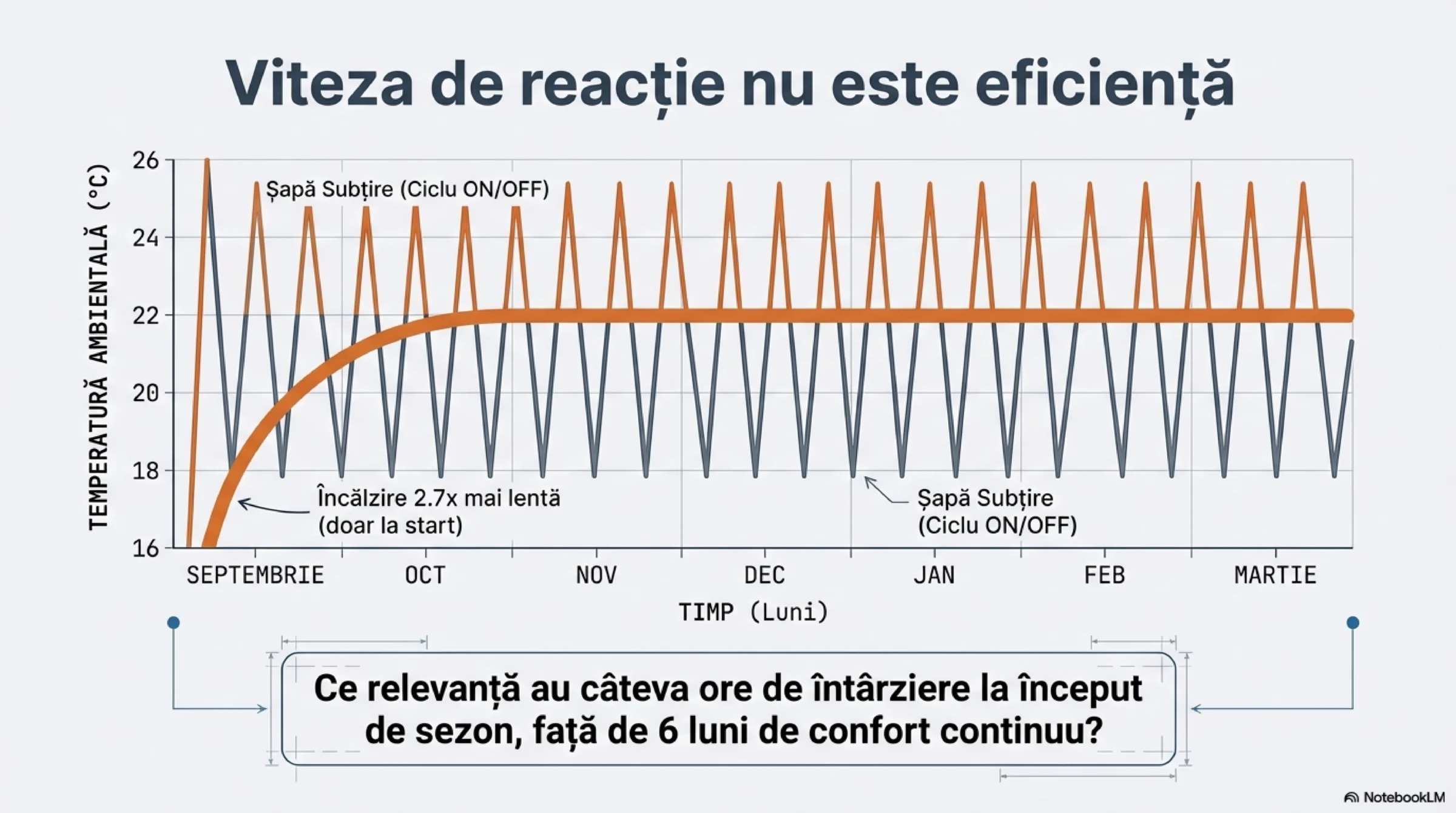 Acesta este motivul pentru care industria vinde termostate ON/OFF pe fiecare perete (ca să facă „reglaj fin”) fuge de șapele groase. Un sistem ON/OFF nu știe să controleze o masă mare de beton; va crea variații uriașe de temperatură și disconfort, pentru că se bazează pe opriri și porniri bruște.