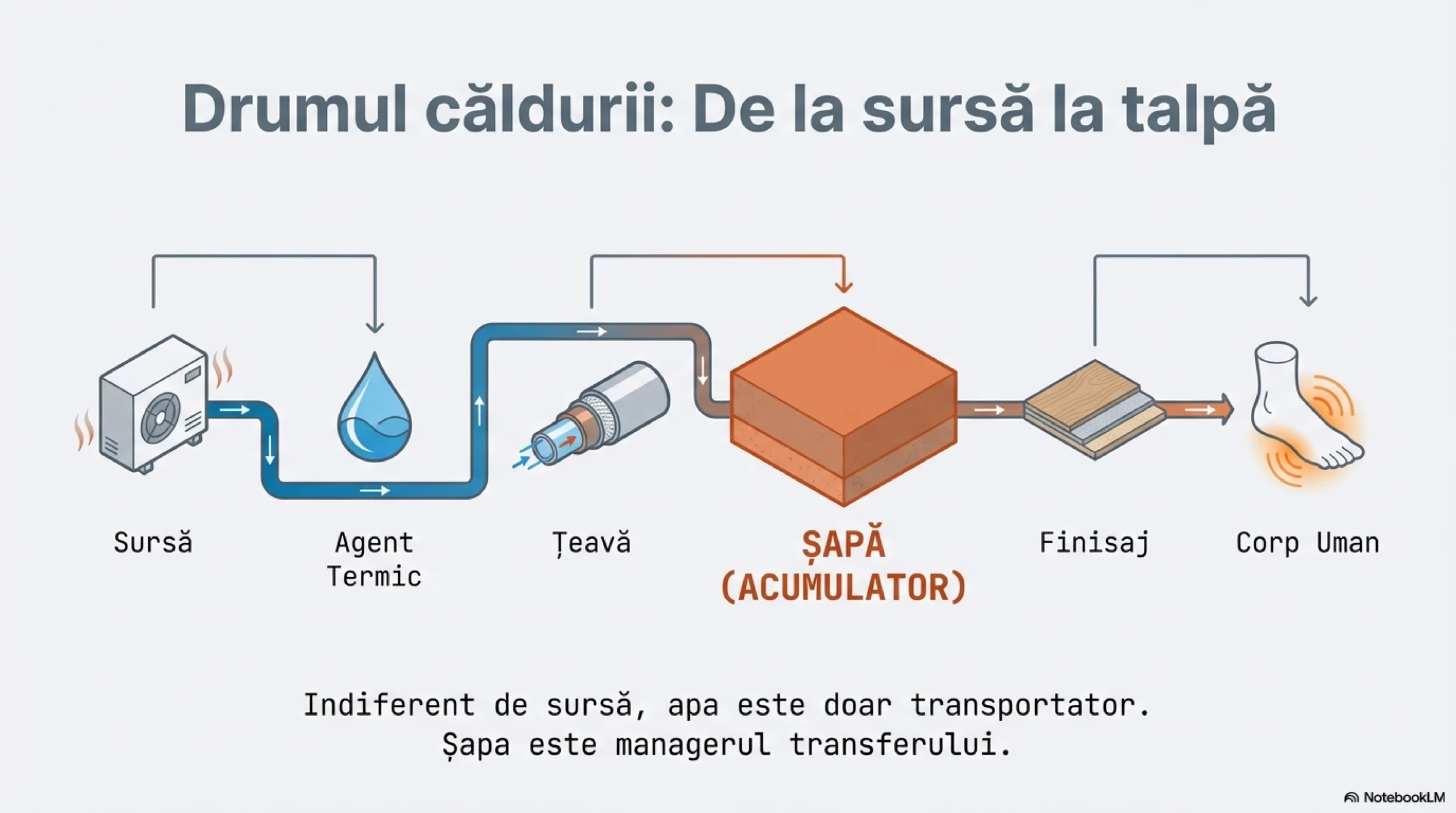 Încălzirea în pardoseală nu este o colecție de accesorii, ci un lanț de transfer termic guvernat de fizică.