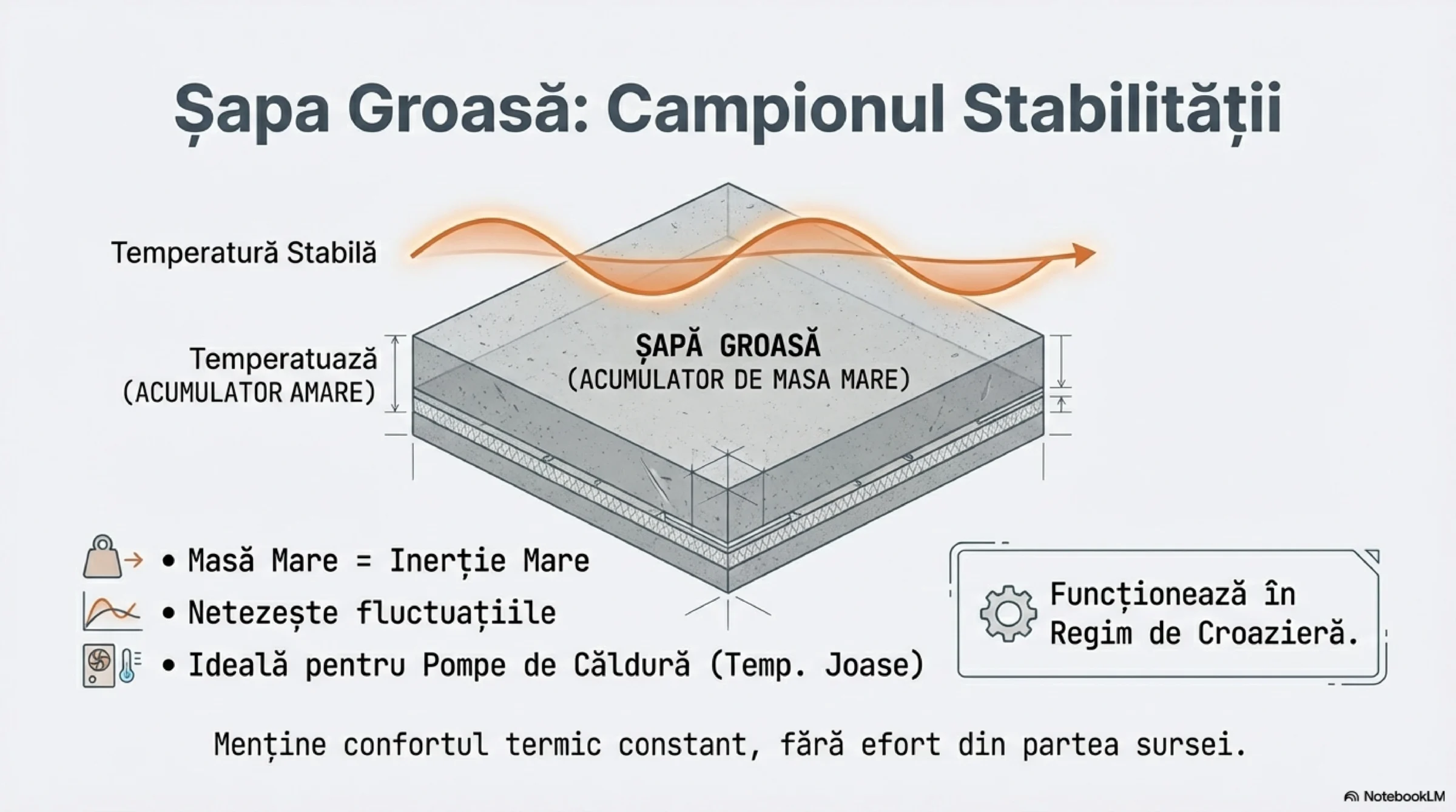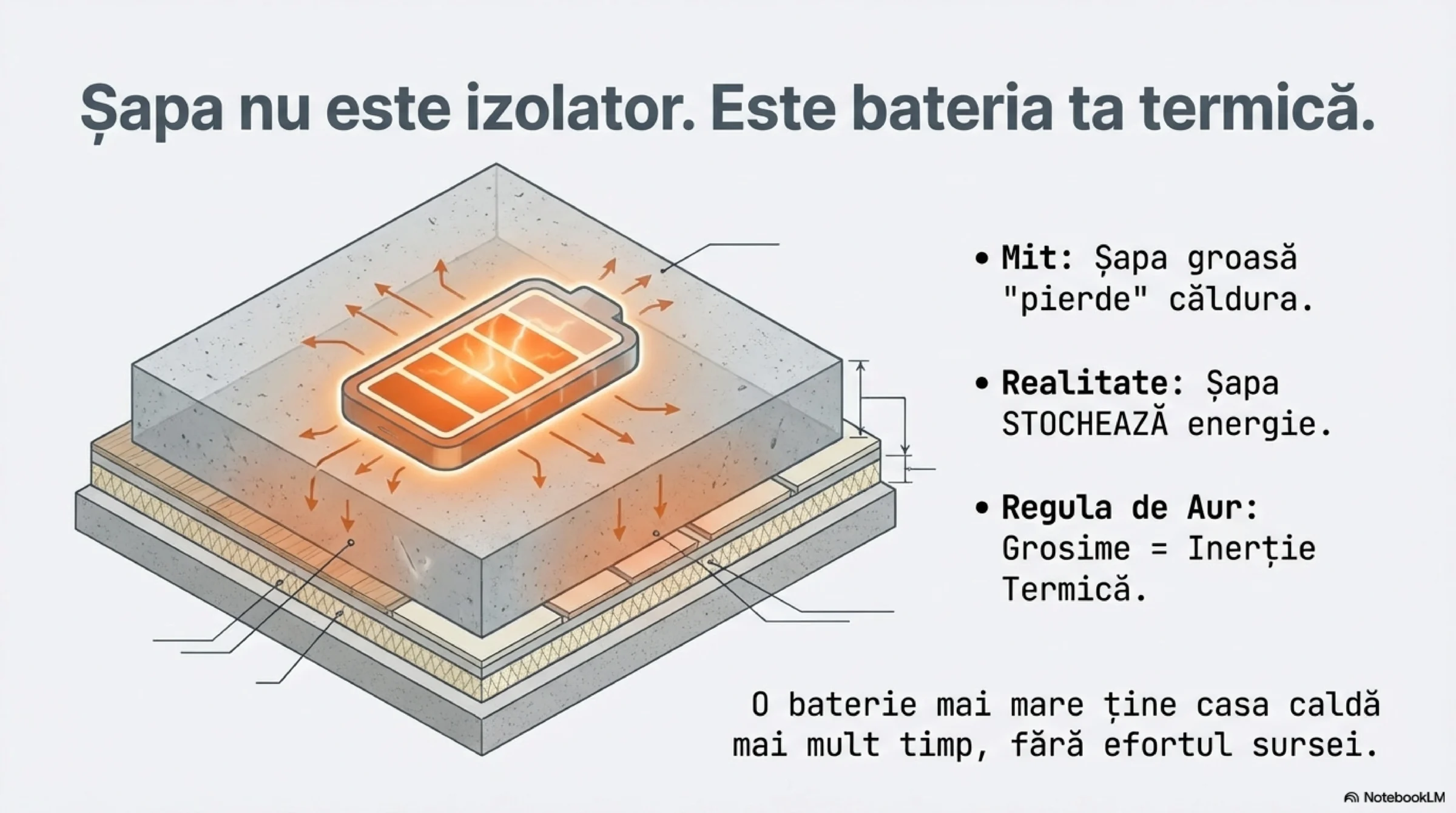 Căldura nu se „pierde” în șapă. Șapa nu este un izolator (precum polistirenul), ci un acumulator. Ea este bateria ta termică.