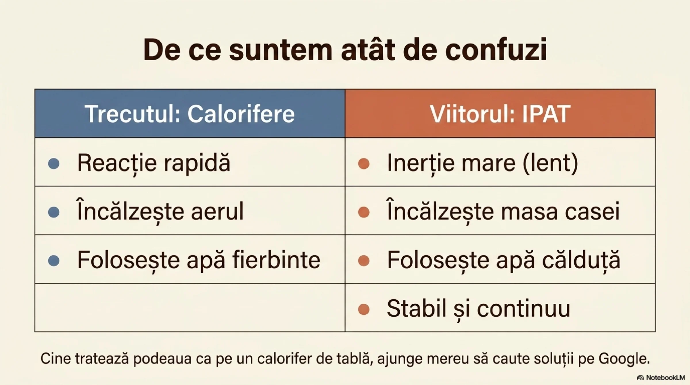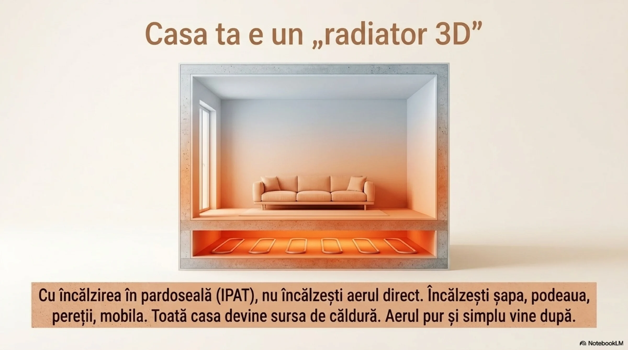 - IPATIPAT = încălzire în pardoseală cu agent termic; în șapă = sistem umed; fără șapă = sistem... nu e aer, e masă termică mare